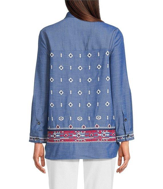 From Calessa, this tunic features:Point collar necklineLong roll-tab buttoned sleevesEmbroidered motifComfort fitStraight hemlineButton front closureApprox. 30" length, from top shoulder to hemPolyesterHand wash cold/line dryImported.
