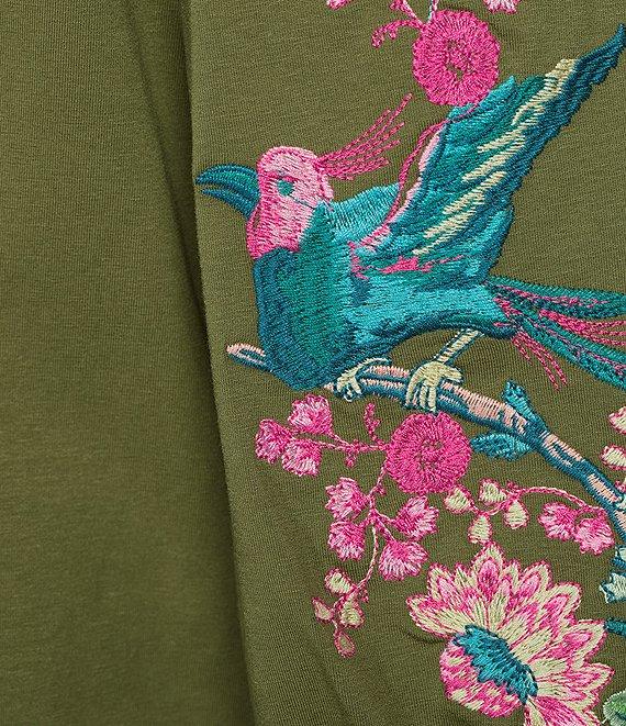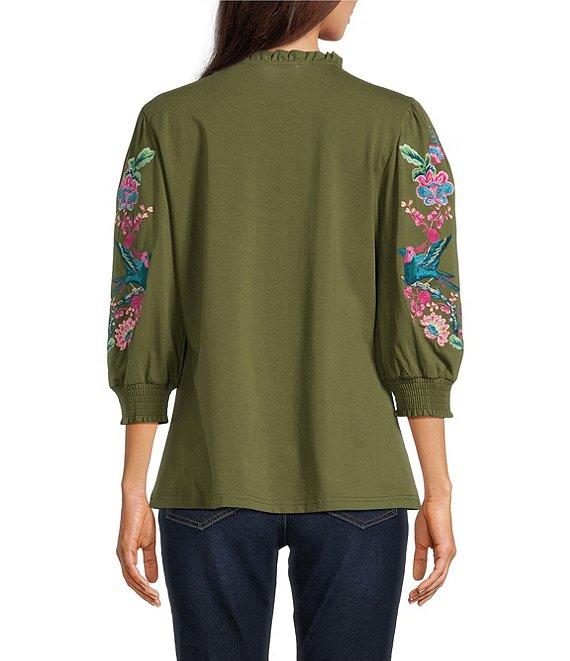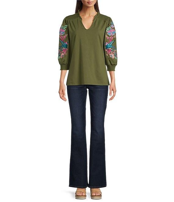 From Calessa, this blouse features: Knit fabrication Split v-neckline 3/4 sleeves Embroidered motif at sleeves Pullover construction Approx. 26" length, from top shoulder to hem Cotton/spandex Hand wash cold/line dry Imported.