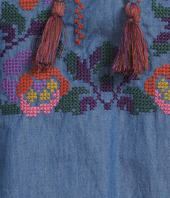From Calessa, this tunic features: Round split neckline with tassel ties Bracelet sleeves Floral embroidered details Straight hemline Pullover construction Approx. 28" length Polyester Hand wash cold/line dry Imported.