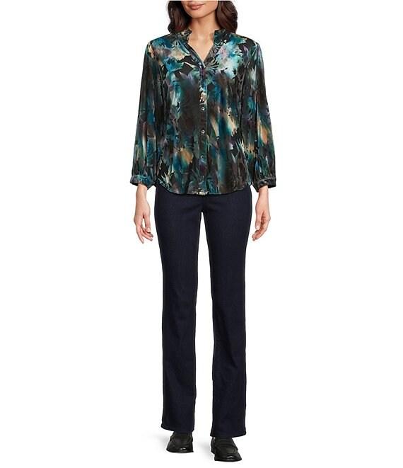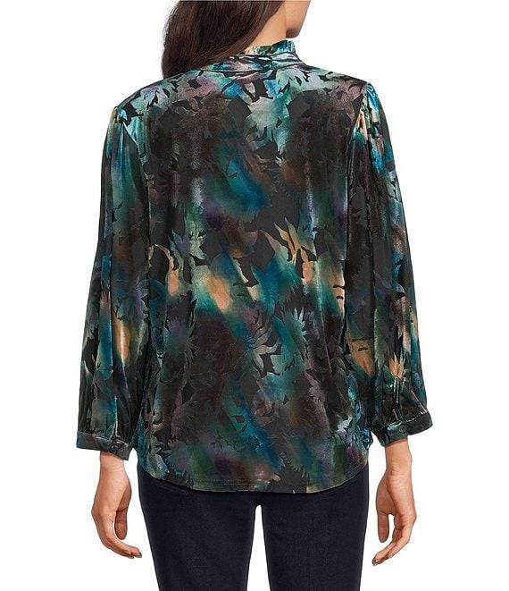 Calessa Petite Size Floral Burnout Velvet Knit Split V-Neck Bracelet Sleeve Button Front Tunic
