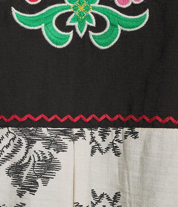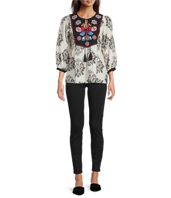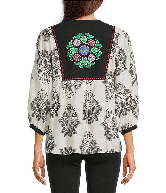 From Calessa, this tunic features: Round split neckline with tassel ties 3/4 sleeves Modern mosaic patchwork print Floral embroidered motif Straight hemline Pullover construction Approx. 29" length Polyester Hand wash cold/line dry Imported.