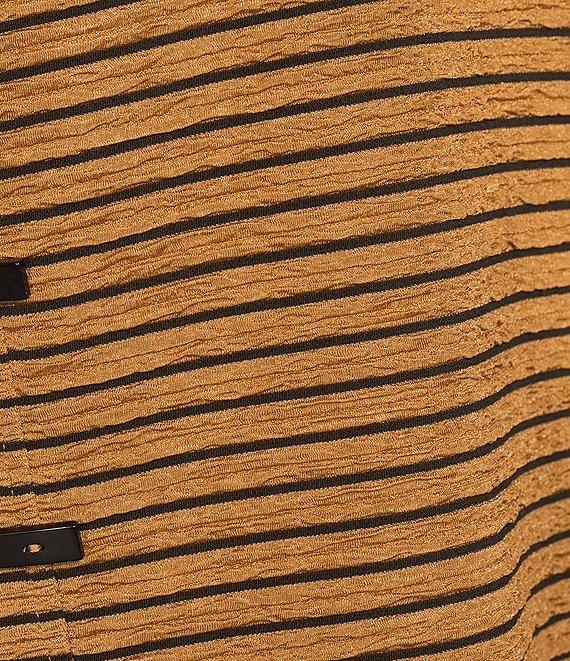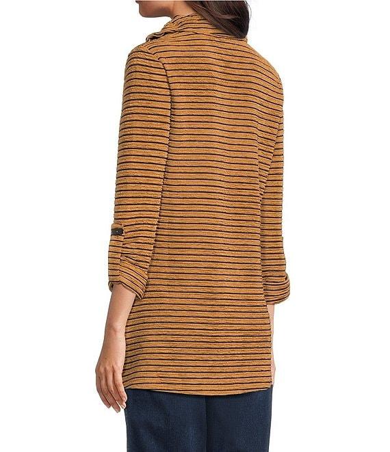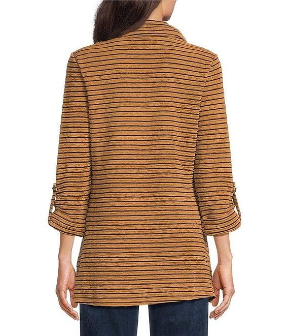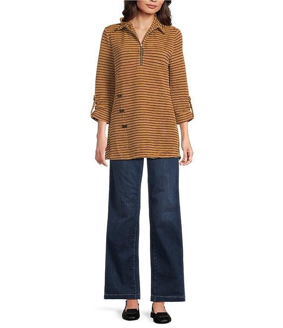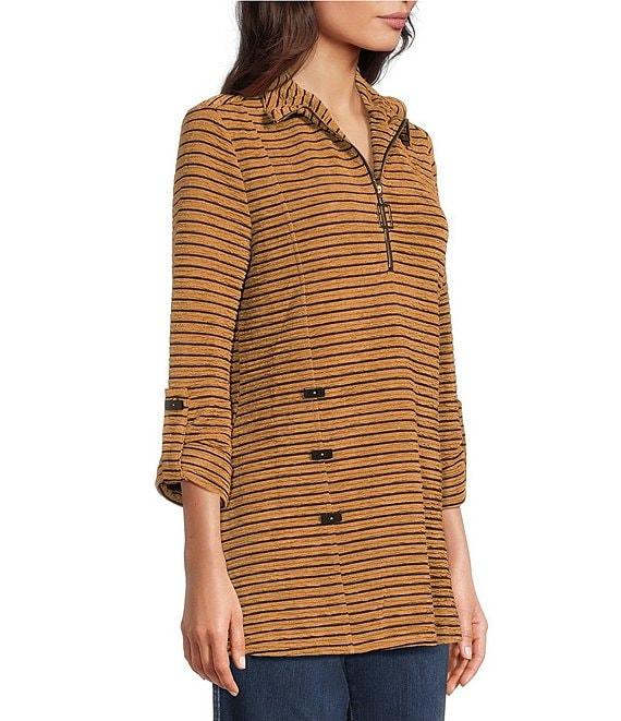 From Calessa Petite, this tunic features: Textured knit fabrication Wire collar with zip opening 3/4 sleeves Yarn dye stripe 2 front pockets Straight hemline Pullover construction Approx. 27.5" length Polyester/spandex Hand wash/ line dry Imported.