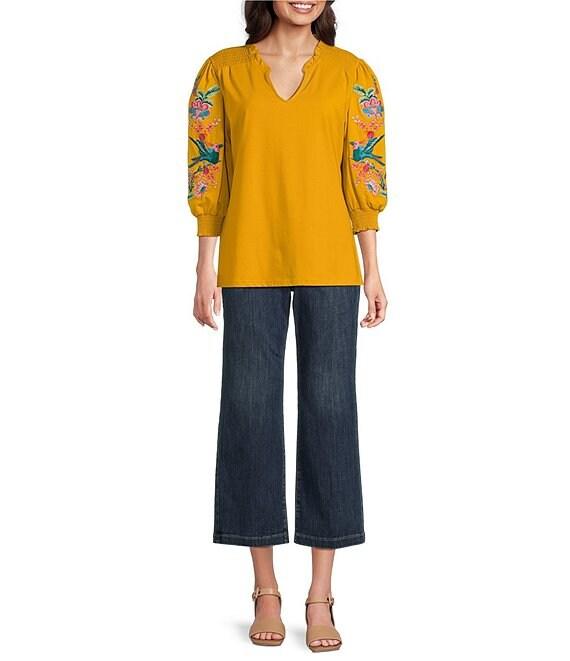 Calessa Petite Size Split V-Neck 3/4 Floral Embroidered Balloon Sleeve Tunic