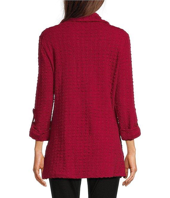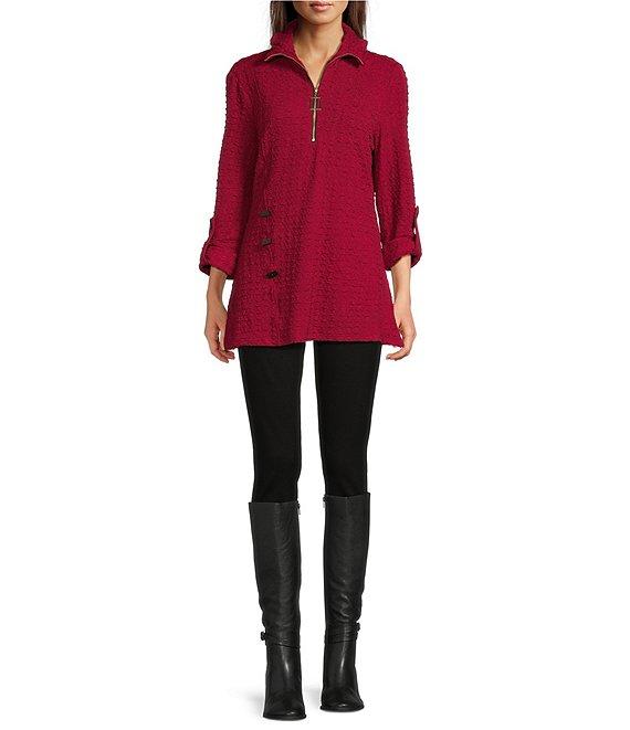 From Calessa, this top features: Textured yarn-dye knit fabrication Wire collar Long roll-tab sleeves with button Two front pockets Curved hem Quarter-zip closure Approx. 29" length Polyester/spandex Machine wash/line dry Imported.