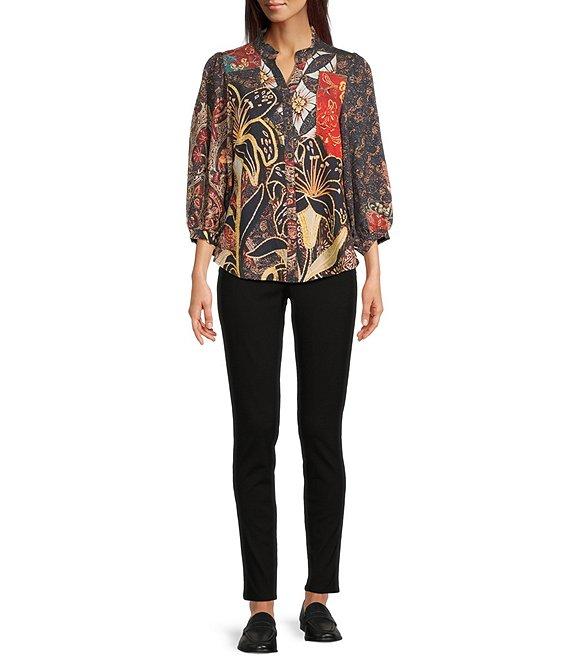 Calessa Petite Size Printed Ruffled Stand Collar Long Sleeve Button Front Tunic