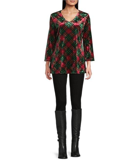 Calessa Plaid Print V-Neck Wrist Length Sleeve Velvet Knit Tunic