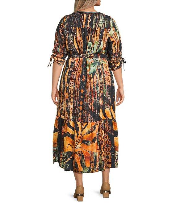 From Calessa Plus, this dress features: Woven fabrication A-line silhouette Banded v-neckline 3/4 sleeves Abstract mosaic print Embroidered bib Self-tie sash Tiered skirt Straight hemline Button front closure Approx. 50" length Polyester Hand wash/line dry Imported.