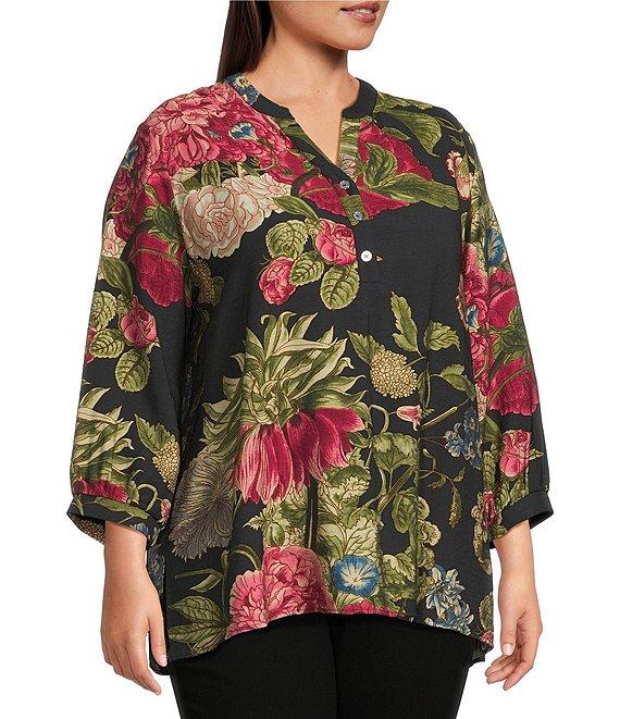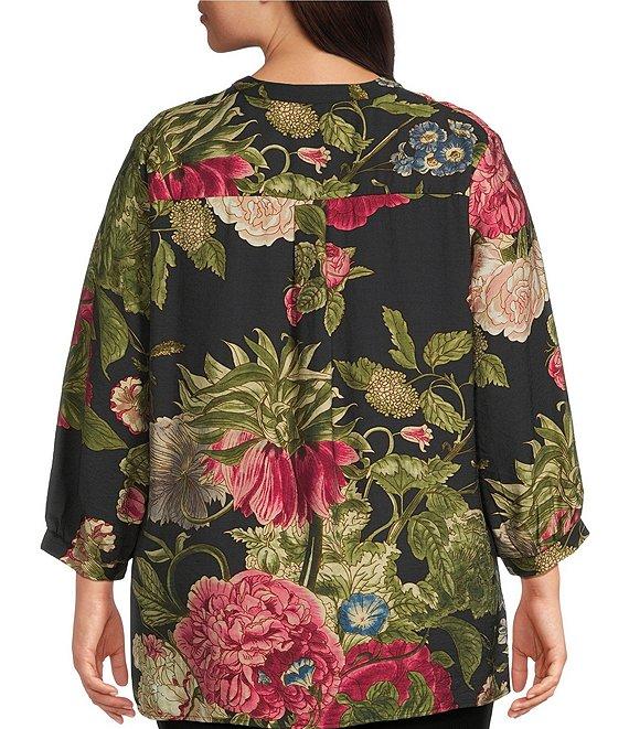 Calessa Plus Size Autumn Garden Banded Split V-Neck 3/4 Sleeve Coordinating Tunic