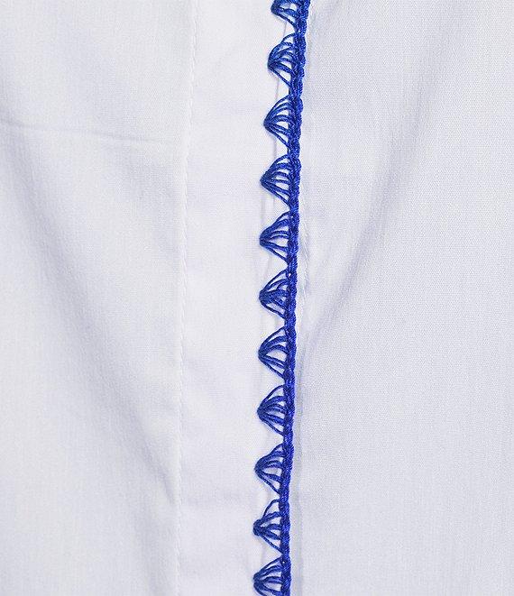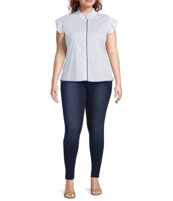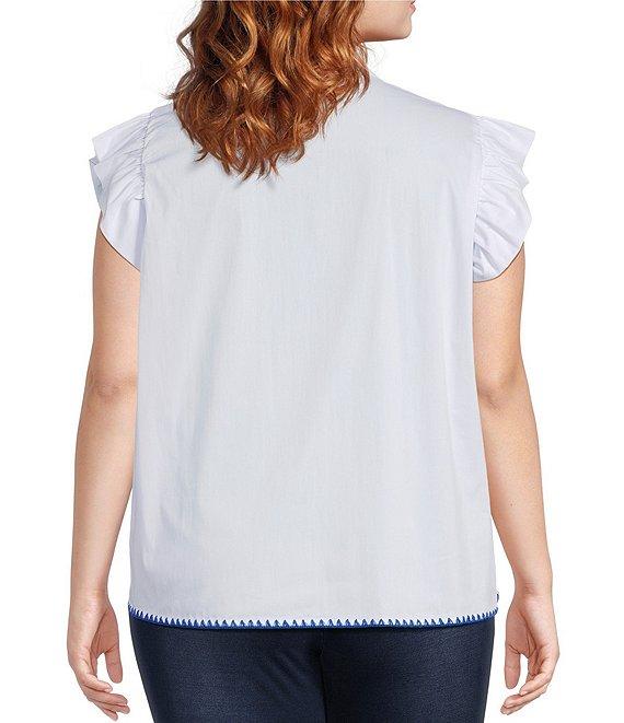From Calessa Plus, this top features: Comfort stretch fabrication Banded collar Cap sleeves Ruffle detail at neck and sleeves Contrast embroidery trim Hidden button-front closure Straight hemline Approx. 29" length Cotton/spandex Hand wash/line dry Imported.