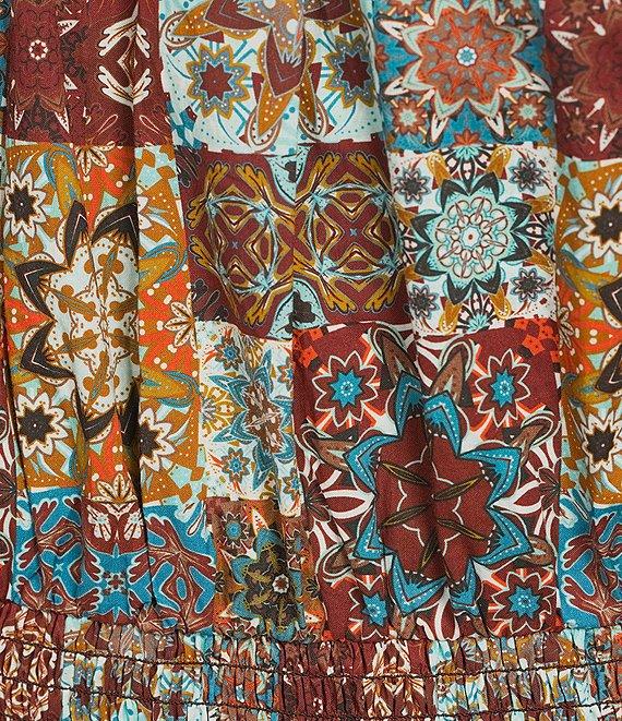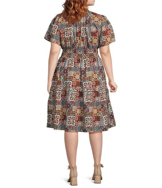 Calessa Plus Size Blue Multi Patchwork Split V-Neck Short Sleeve Smocked Waist Tiered A-Line Dress