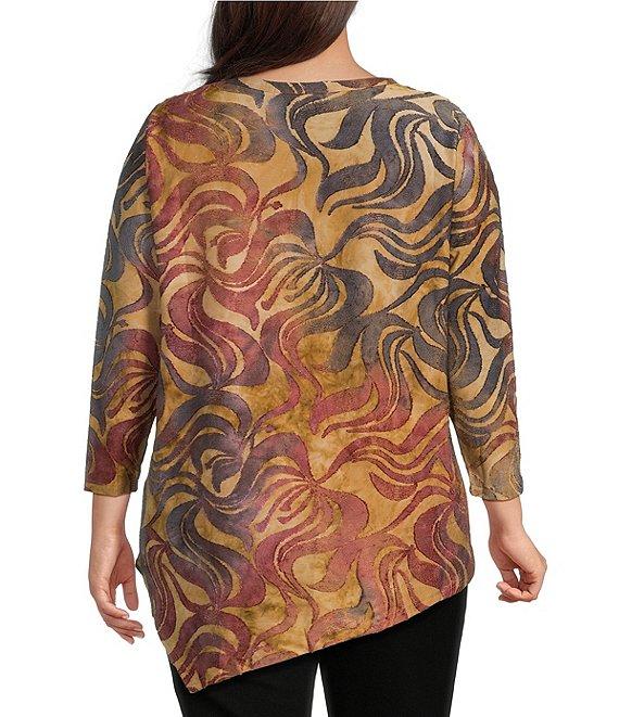 Calessa Plus Size Burnout Tie-Dye Printed Crew Neck 3/4 Sleeve Asymmetric Dipped Hem Tunic