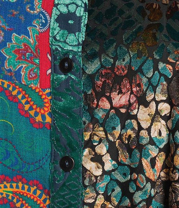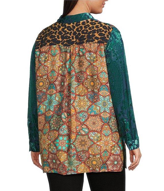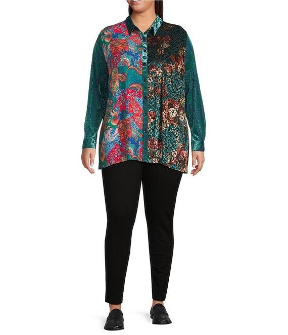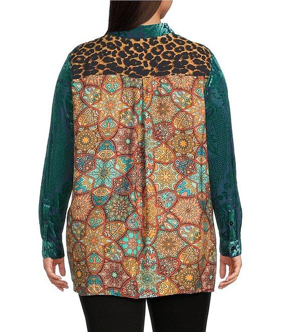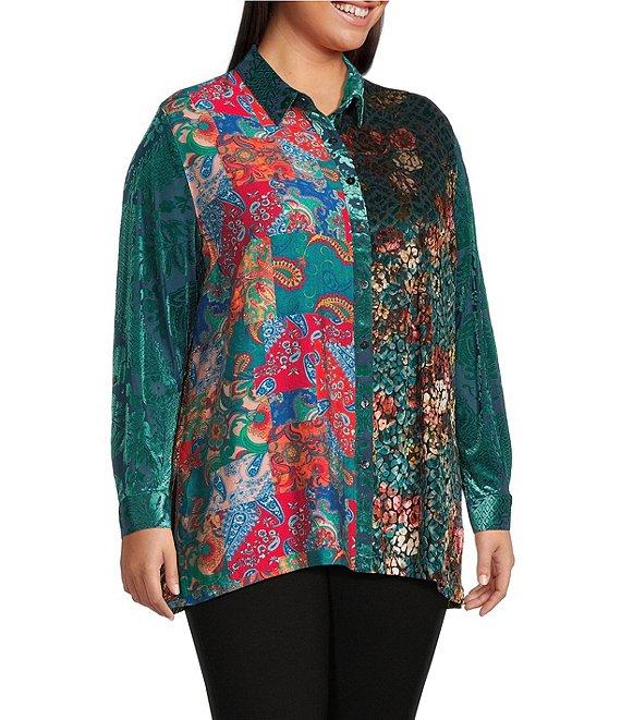 Calessa Plus Size Crinkle Woven Patchwork Point Collar Long Sleeve Button Front Shirt