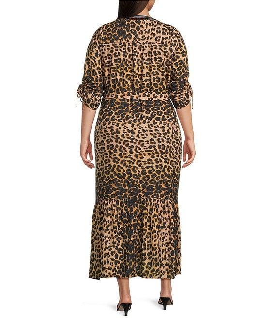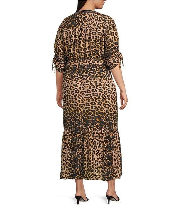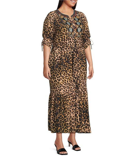 From Calessa Plus, this dress features: Woven fabrication Split v-neckline 3/4 ruched sleeves with tie details Comfort fit Embroidered front bib Leopard print Single tiered hemline Self-tie sash belt Pullover with half placket closure Approx. 52" length Polyester Hand wash/line dry Imported.