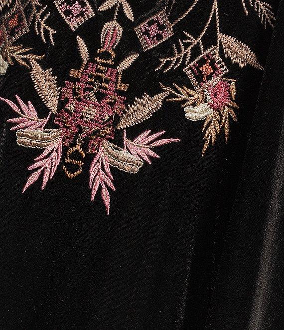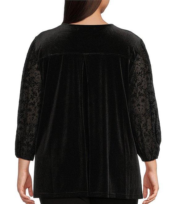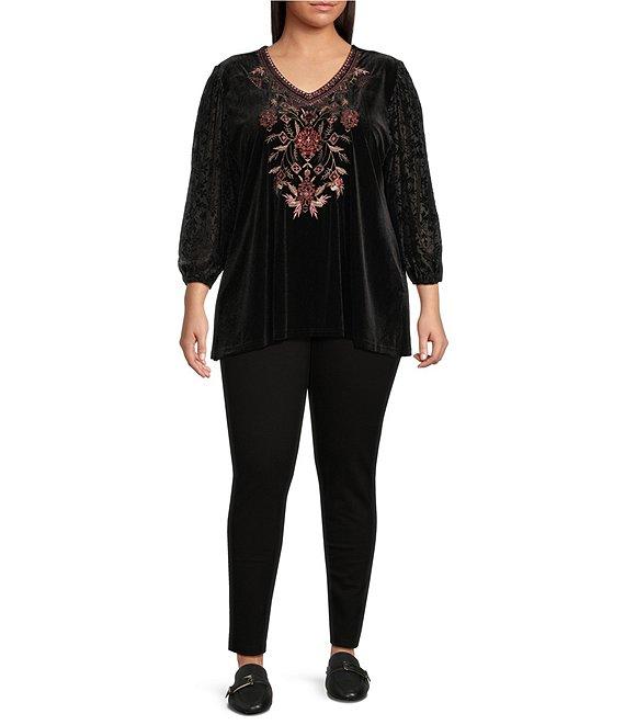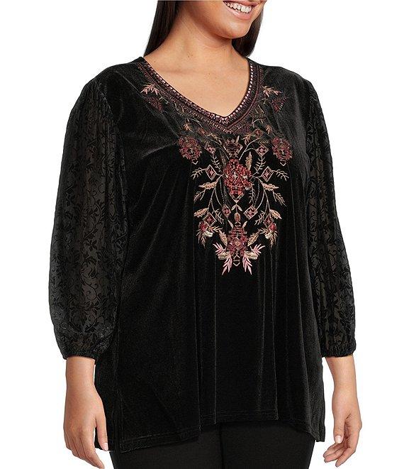 Calessa Plus Size Embroidered Burnout Velvet Floral V-Neck 3/4 Sleeve Knit Tunic