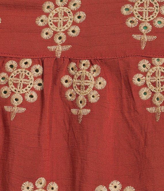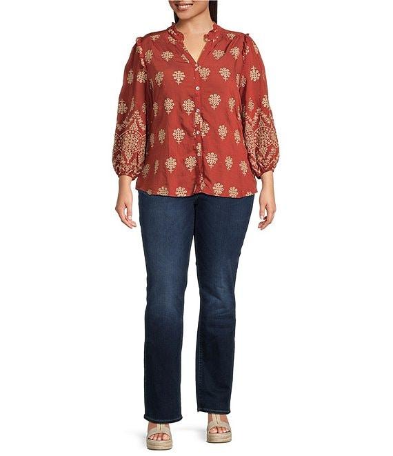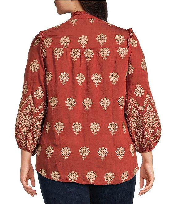 Calessa Plus Size Embroidered Medallion Ruffle Notch V-Neck Bracelet Sleeve Button-Front Tunic