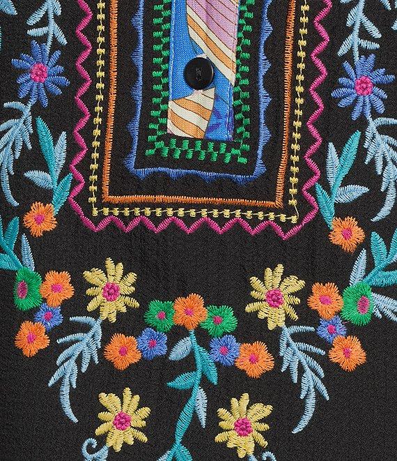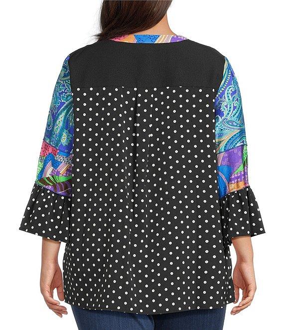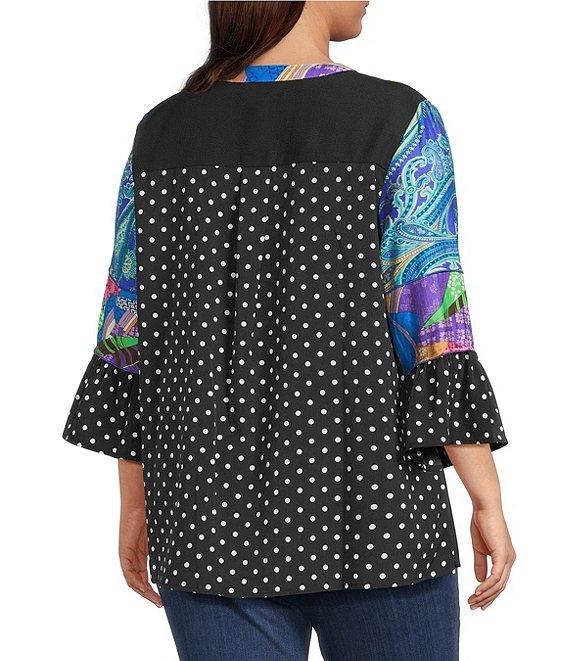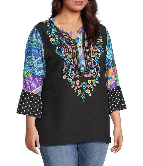 Calessa Plus Size Embroidered Patchwork Split V-Neck 3/4 Polka Dot Print Sleeve Tunic