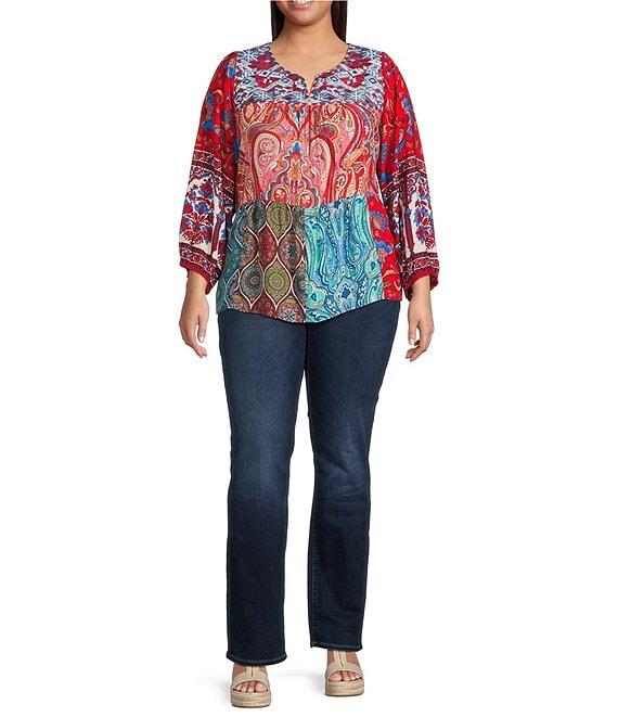 Calessa Plus Size Embroidered Printed Split V-Neck 3/4 Sleeve Tunic