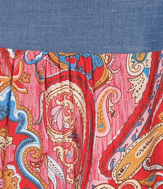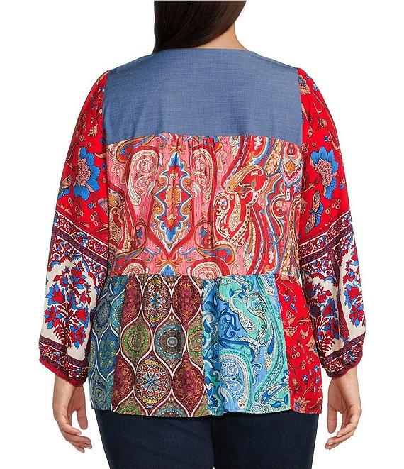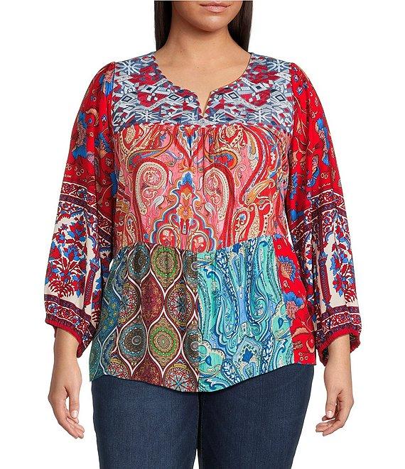 From Calessa Plus, this tunic features: Split neckline 3/4 sleeves Comfort fit Embroidered motif Patchwork print Pullover construction Straight hem Approx. 31" length, from top shoulder to hem Rayon Hand wash/line dry Imported.