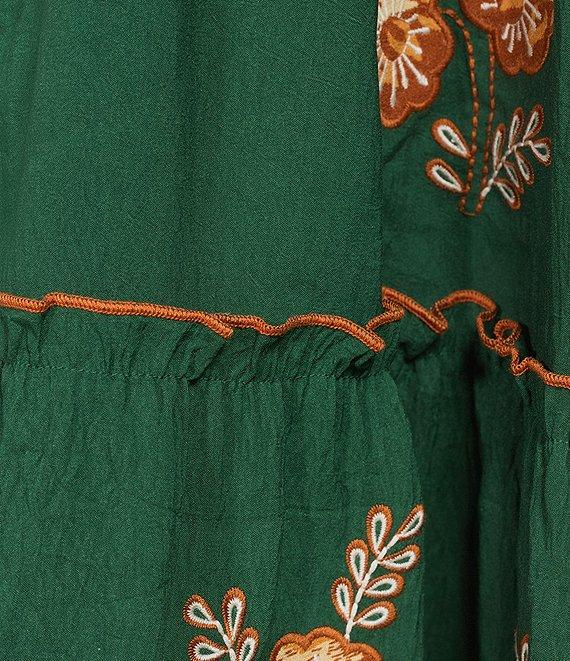 From Calessa Plus, this dress features: Comfort fabrication Empire waist silhouette Split v-neckline 3/4 balloon sleeves Floral embroidered detail Tiered long skirt Straight hemline Pullover construction Midi length Approx. 52" length Polyester Hand wash cold/flat dry Imported.