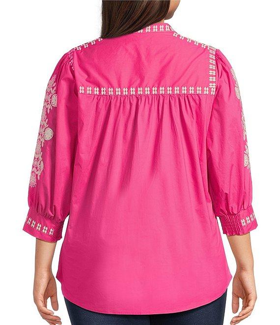 Calessa Plus Size Embroidered Split V-Neck 3/4 Sleeve Button Front Shirt