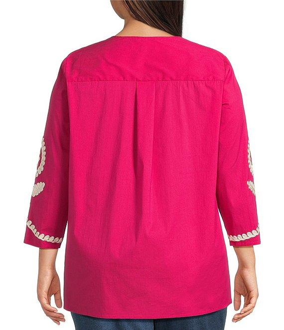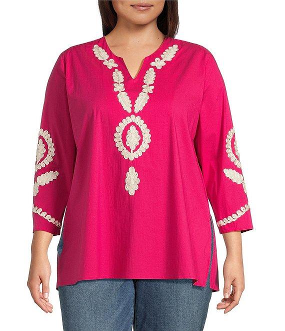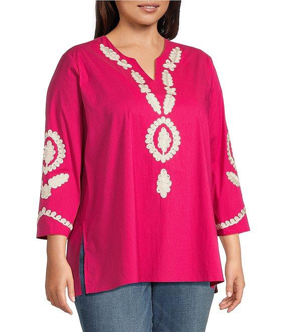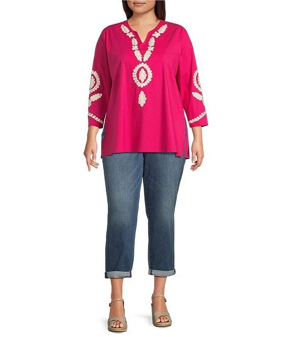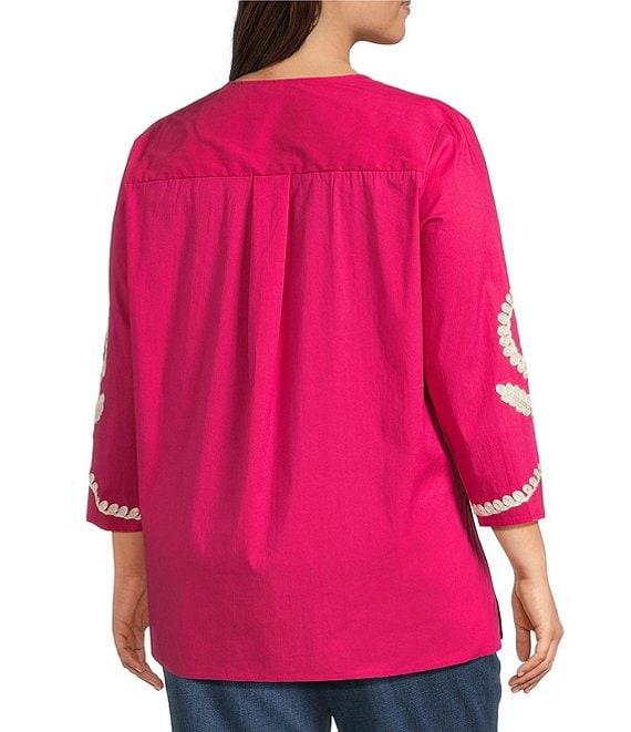 Calessa Plus Size Embroidered Split V-Neck 3/4 Sleeve Tunic