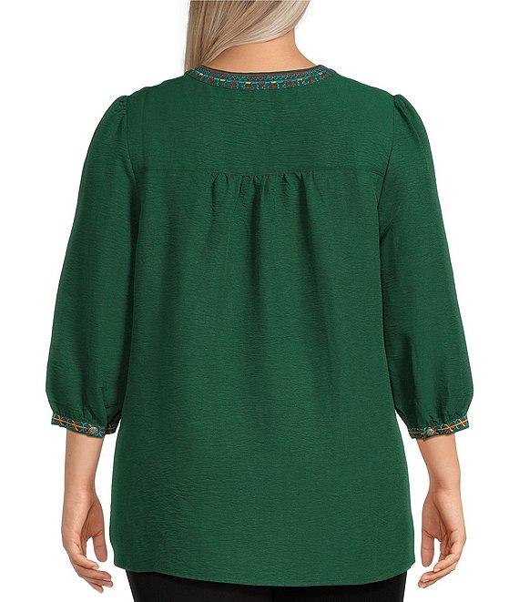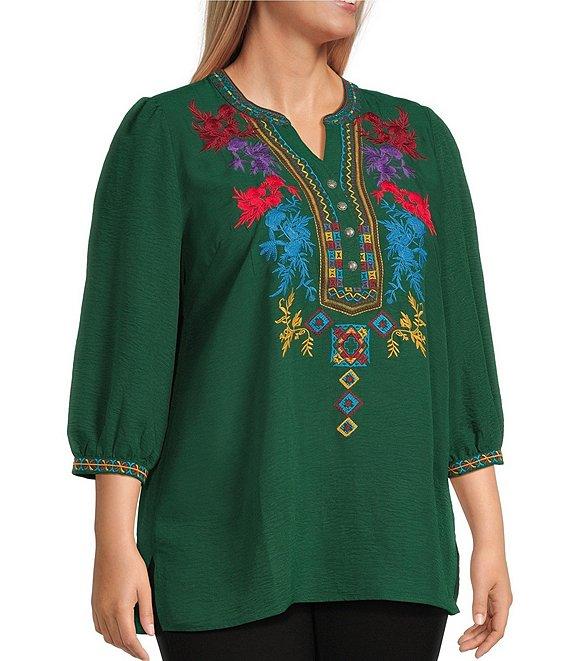 Calessa Plus Size Embroidered Split V-Neck 3/4 Sleeve Tunic