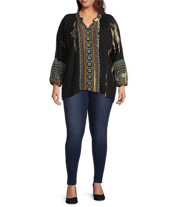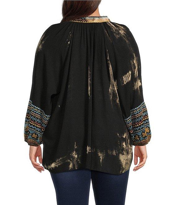 Calessa Plus Size Embroidered Split V-Neck Long Sleeve Tunic