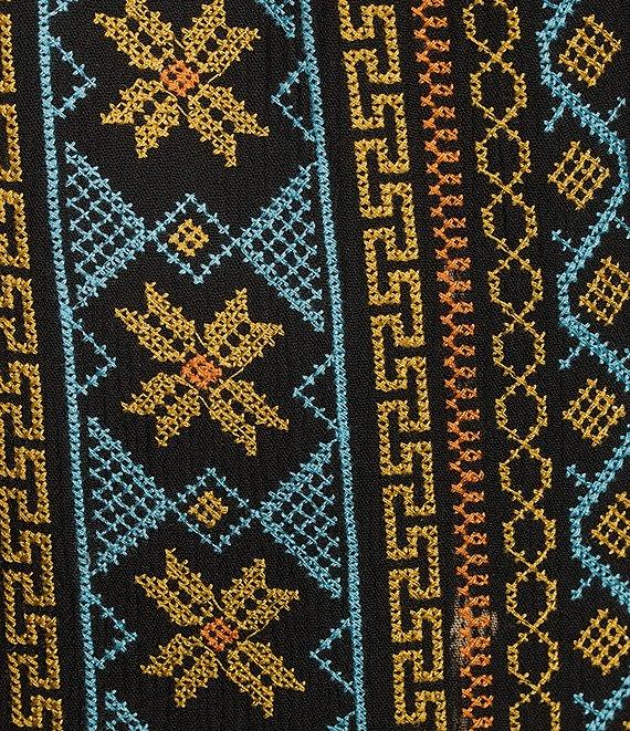 From Calessa Plus, this tunic features: Woven fabrication Split v-neckline Long sleeves Embroidered motif Straight hem Pullover construction Approx. 32" length Polyester Hand wash/line dry Imported.