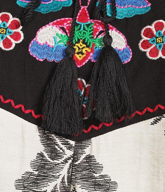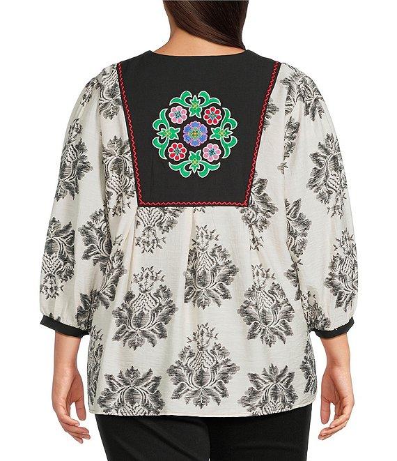From Calessa Plus, this tunic features: Round split neckline with tassel ties 3/4 sleeves Modern mosaic patchwork print Floral embroidered motif Straight hemline Pullover construction Approx. 31" length Polyester Hand wash cold/line dry Imported.