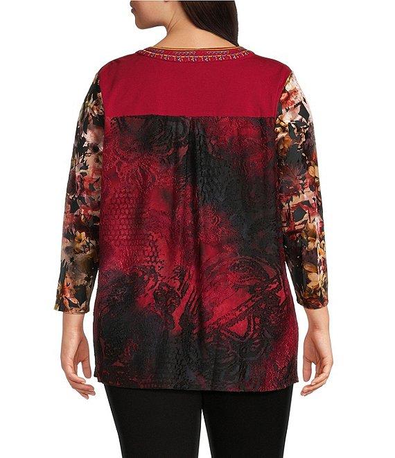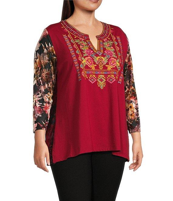From Calessa Plus, this tunic features: Embroidered velvet tie-dye knit fabrication Split v-neckline 3/4 sleeves Comfort Straight hemline Pullover construction Approx. 31.5" length, from top shoulder to hem Polyester/spandex Hand wash/line dry Imported.