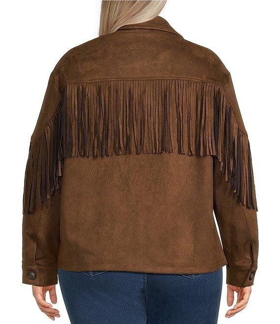 Calessa Plus Size Faux Suede Fringe Point Collar Long Sleeve Shirt Jacket
