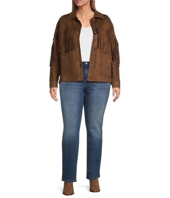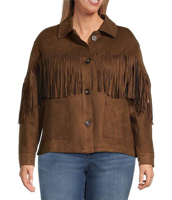 From Calessa Plus, this jacket features: Faux suede fabrication Fringe detail Point collar Long sleeves Front functional pockets Straight hemline Button front closure Approx. 28" length Dry clean only Imported.
