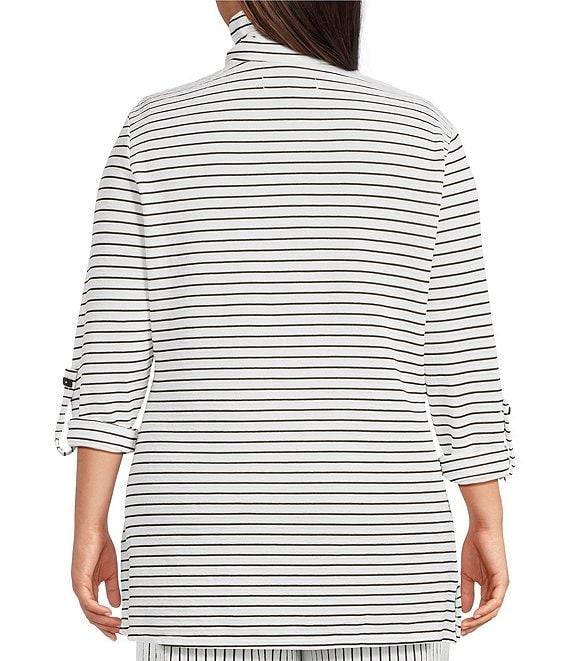 From Calessa Plus, this tunic features: Textured yarn-dye knit fabrication Wire collar 3/4 roll-tab sleeves Comfort fit Button accent details Side pockets Straight hem with side vents Quarter zip closure Approx. 32" length Polyester/spandex Machine wash/line dry Imported.