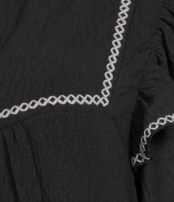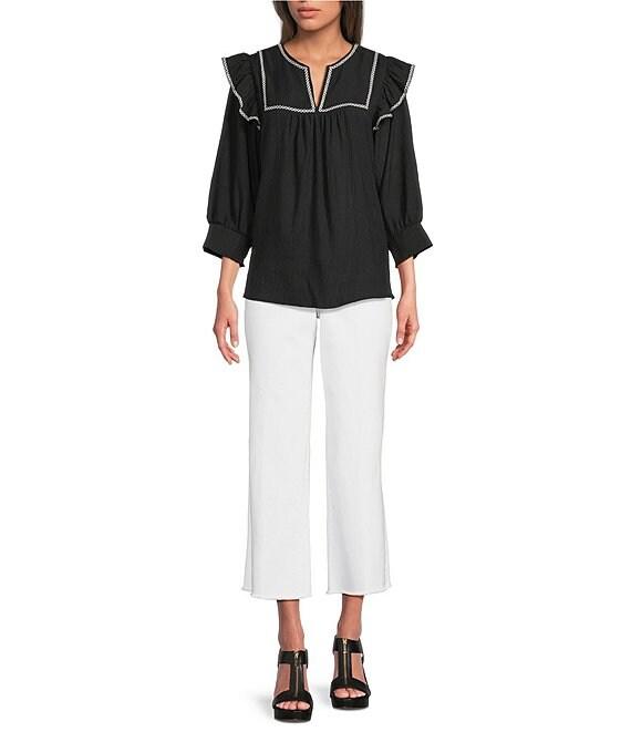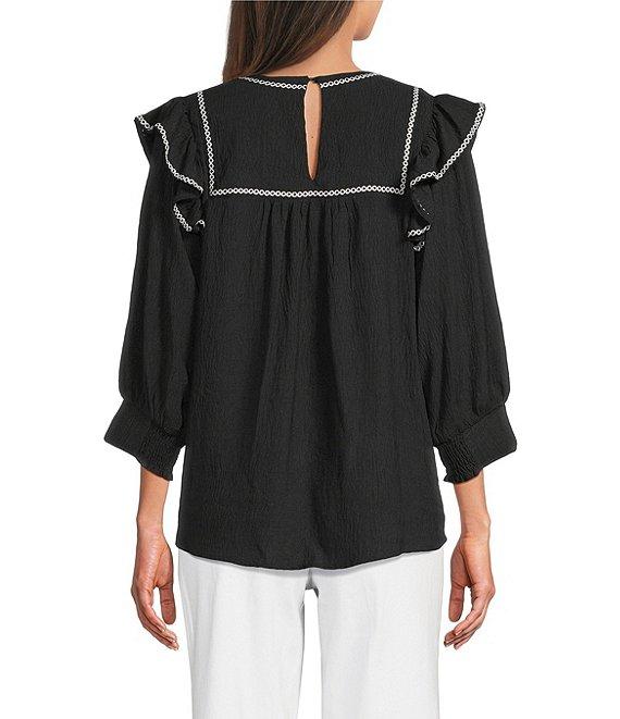 From Calessa, this tunic features: Round split v-neckline 3/4 sleeves with ruffle detail Cross stitch trim detail Straight hemline Pullover construction Approx. 28" length Polyester Hand wash/line dry Imported.