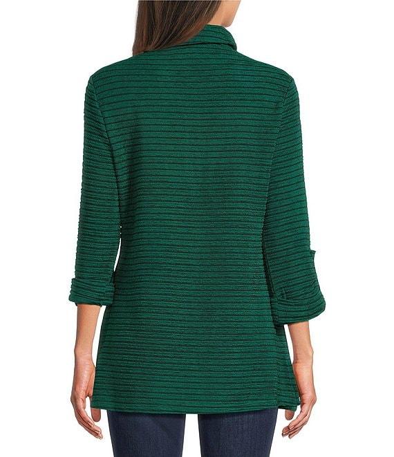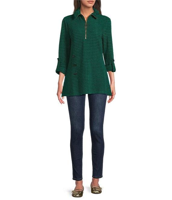 From Calessa, this top features: Textured yarn-dye knit fabrication Wire collar 3/4 sleeves Two front pockets Curved hem Quarter-zip closure Approx. 29" length Polyester/spandex Hand wash/line dry Imported.
