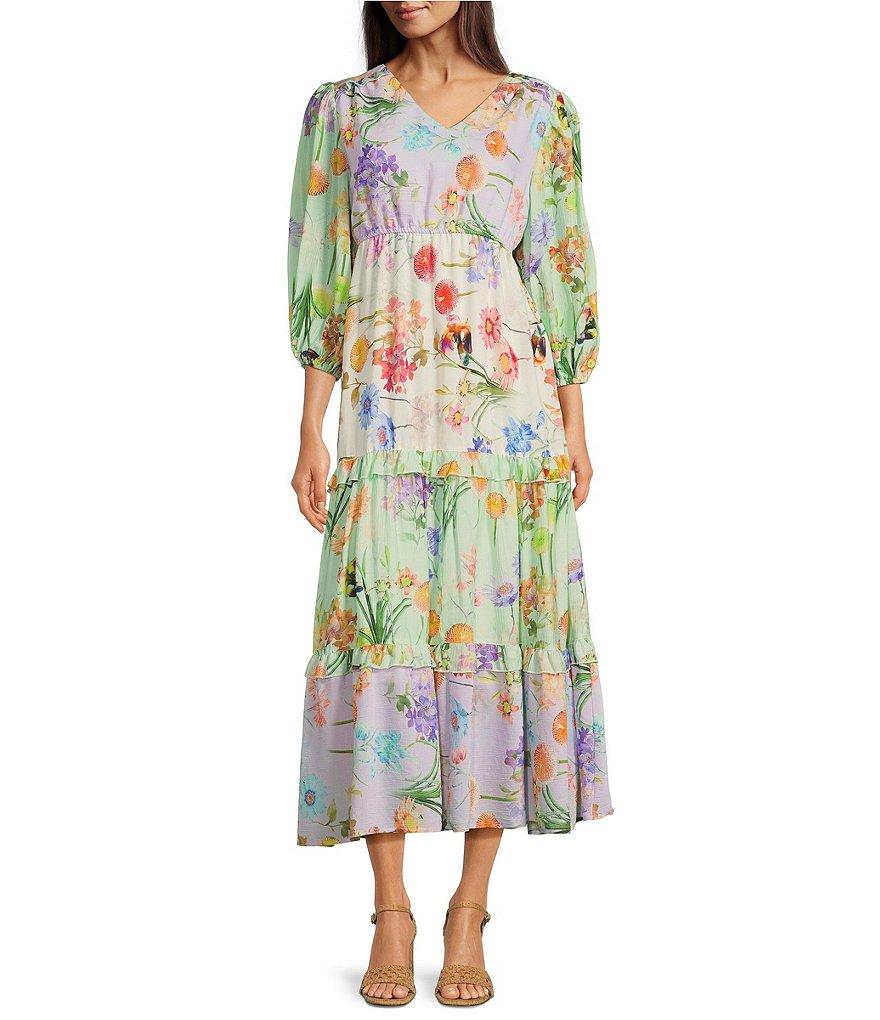 From Calessa, this dress features: A-line silhouette V-neckline Wrist-length elasticated sleeves Vintage floral print Comfort fit Tiered skirt Pullover construction Approx. 50" in length Polyester Hand wash or gentle cycle on cold; lay flat to dry Imported.