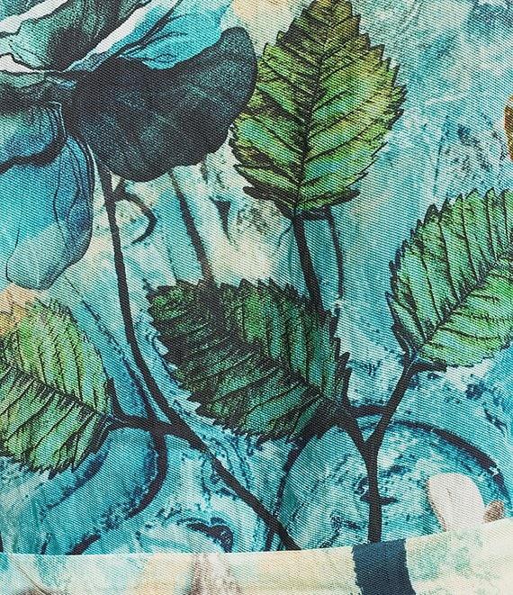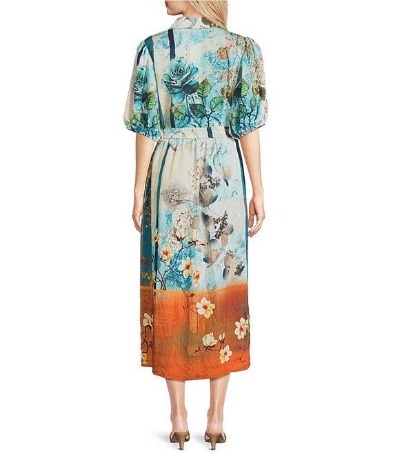 Calessa Woven Border Leaf Print Point collar Elbow Sleeve Button-Front Midi Dress