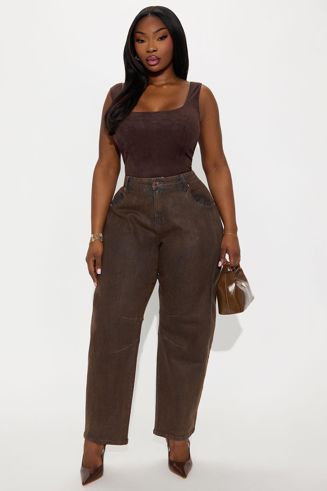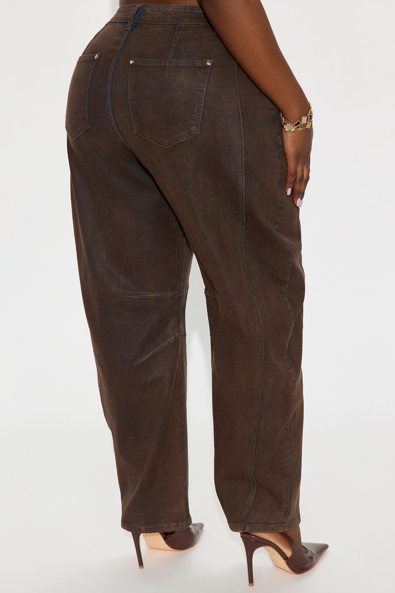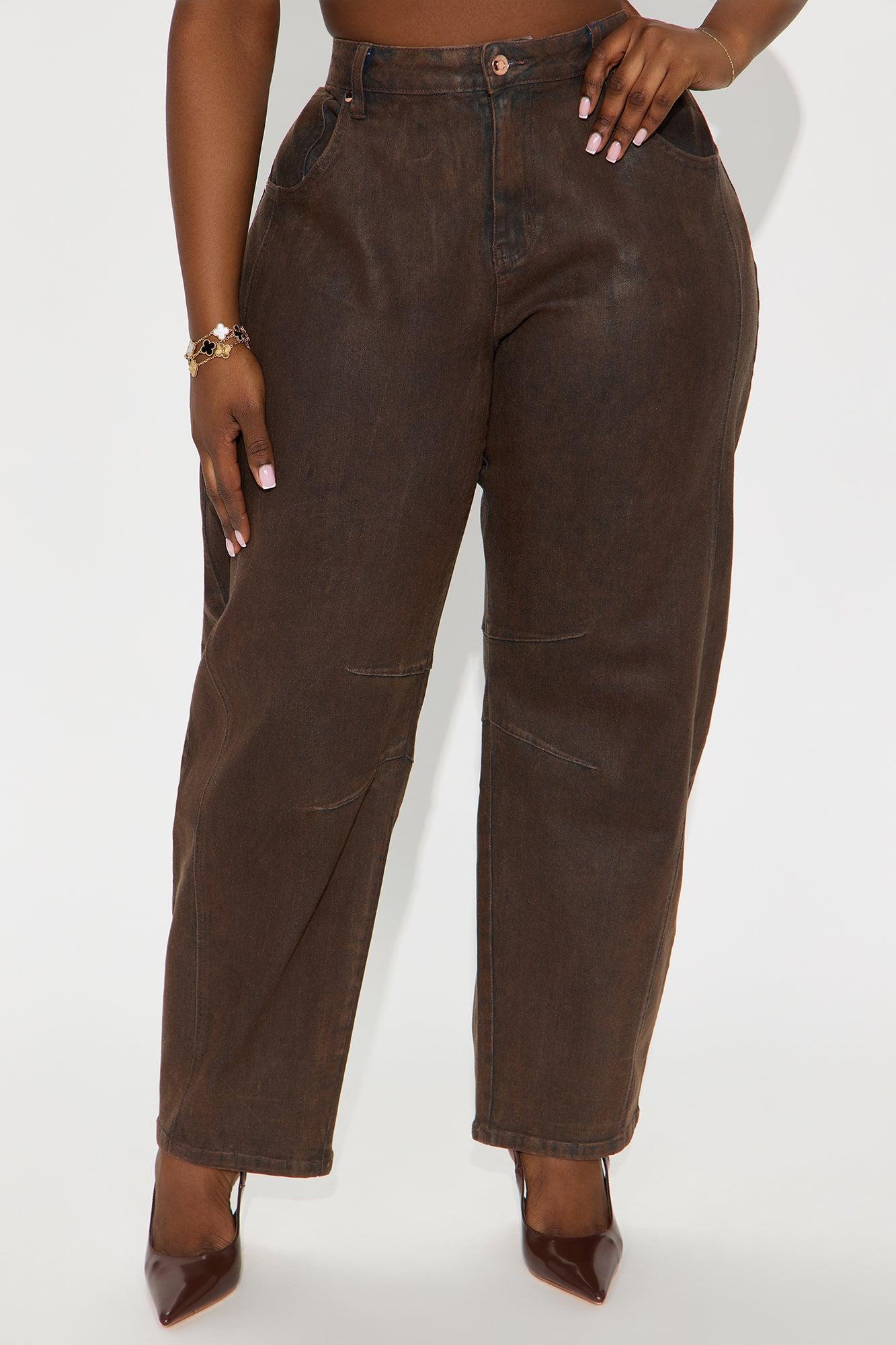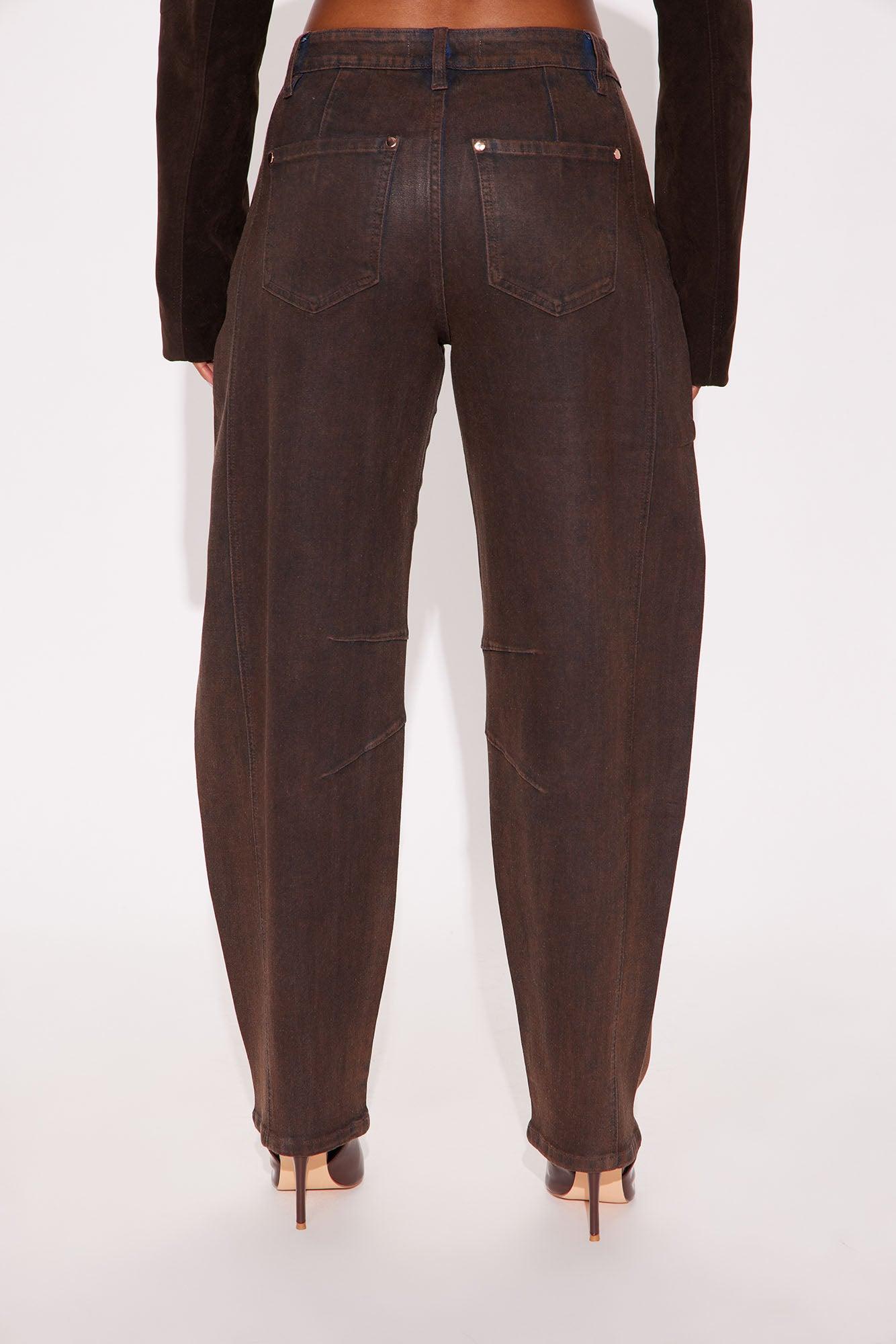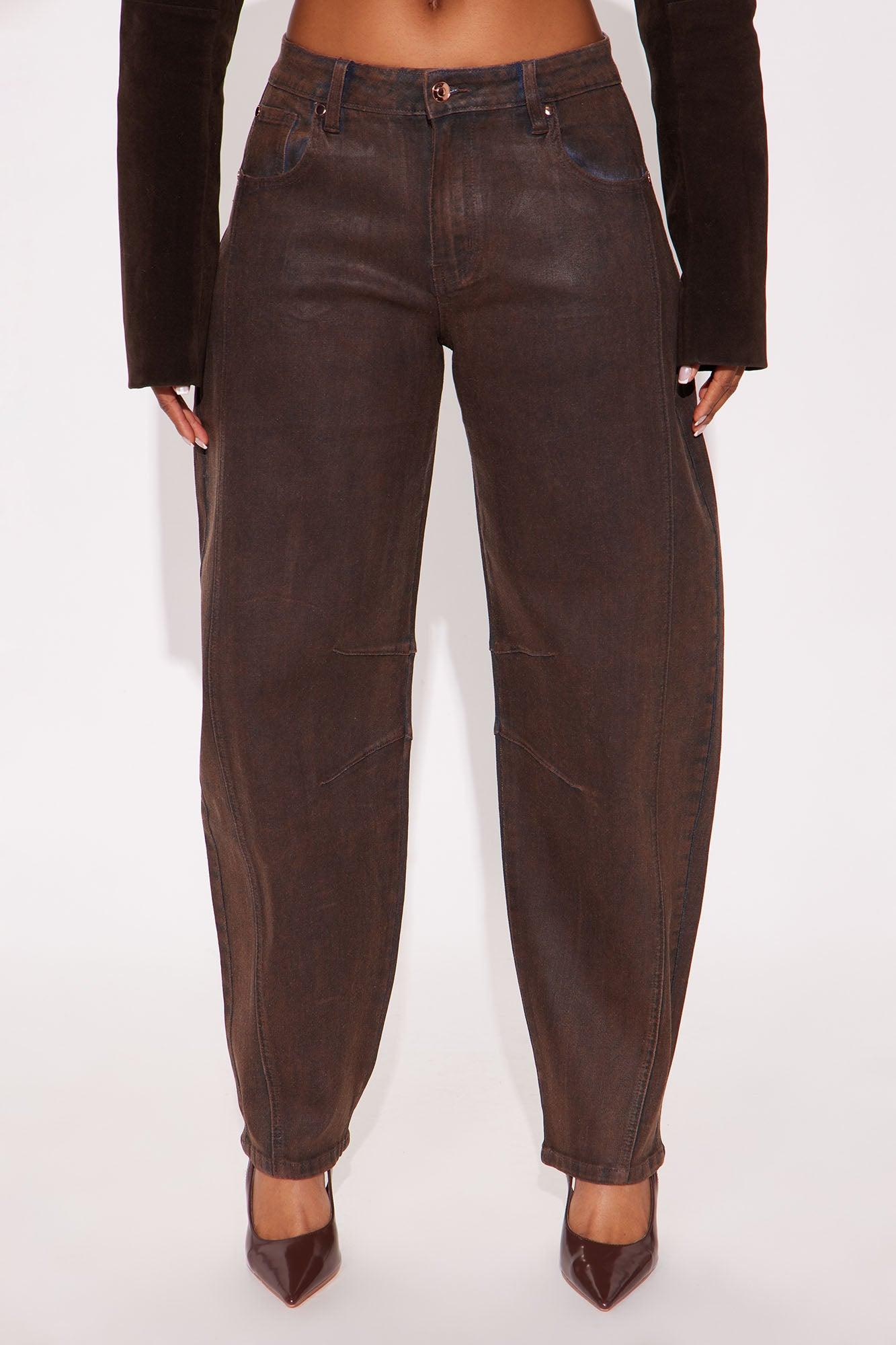 Available In Brown. Barrel Leg Jean 5 Pocket Coated 11" Rise 30" Inseam Medium Stretch Disclaimer: Due To The Specialized Dye Process, Each Garment Is Unique Self: 58% Cotton 39.5% Polyester 1.5% Viscose 1% Spandex Imported California Proposition 65WARNING: Cancer and Reproductive Harm - www.P65Warnings.ca.gov.