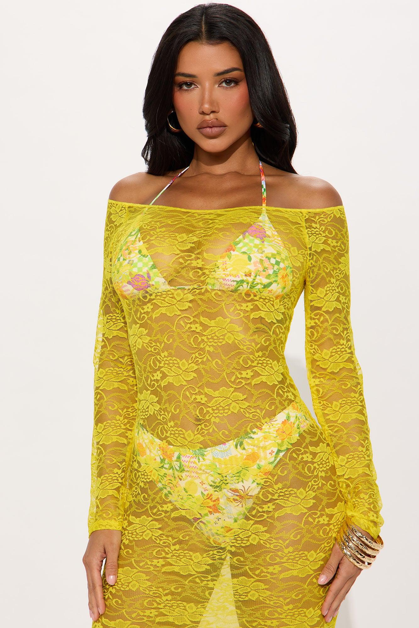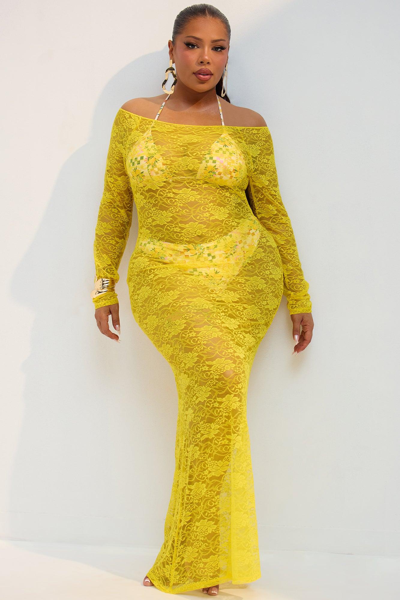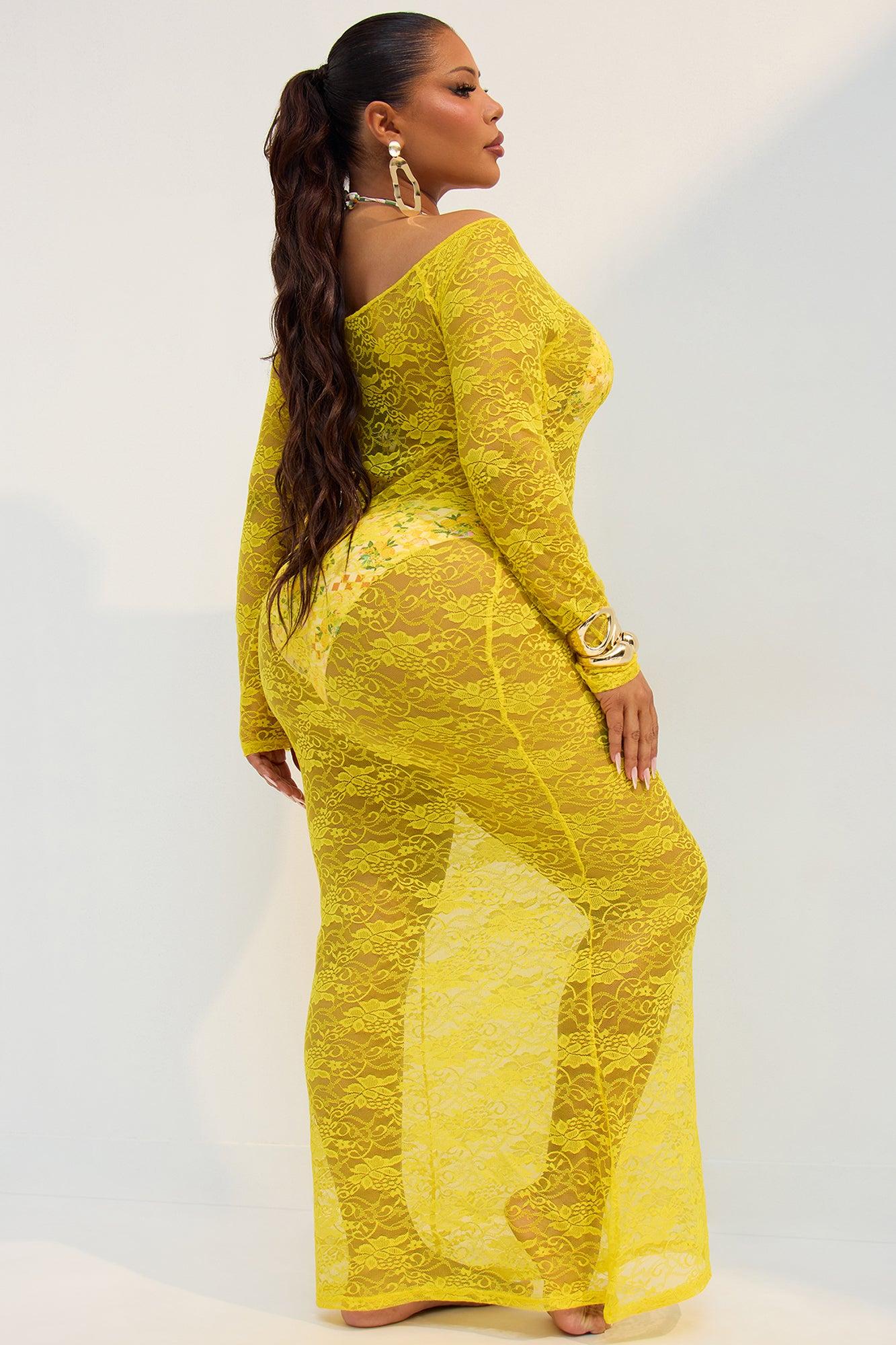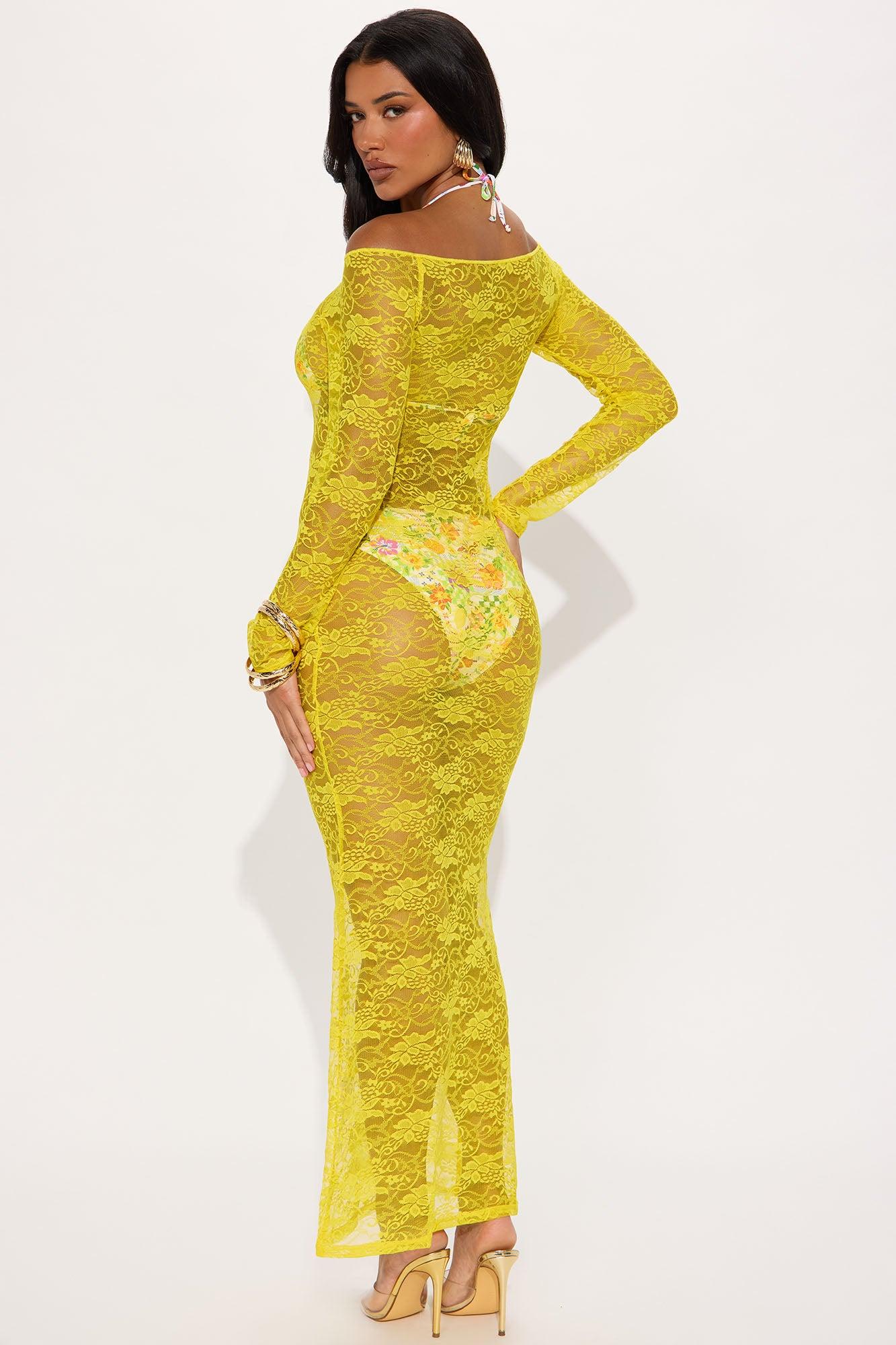 Available In Yellow. Swim Cover Up Dress Maxi Lace Long Sleeves Full Stretch Final Sale 88% Nylon 12% Spandex Imported California Proposition 65WARNING: Cancer and Reproductive Harm - www.P65Warnings.ca.gov.
