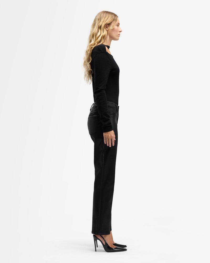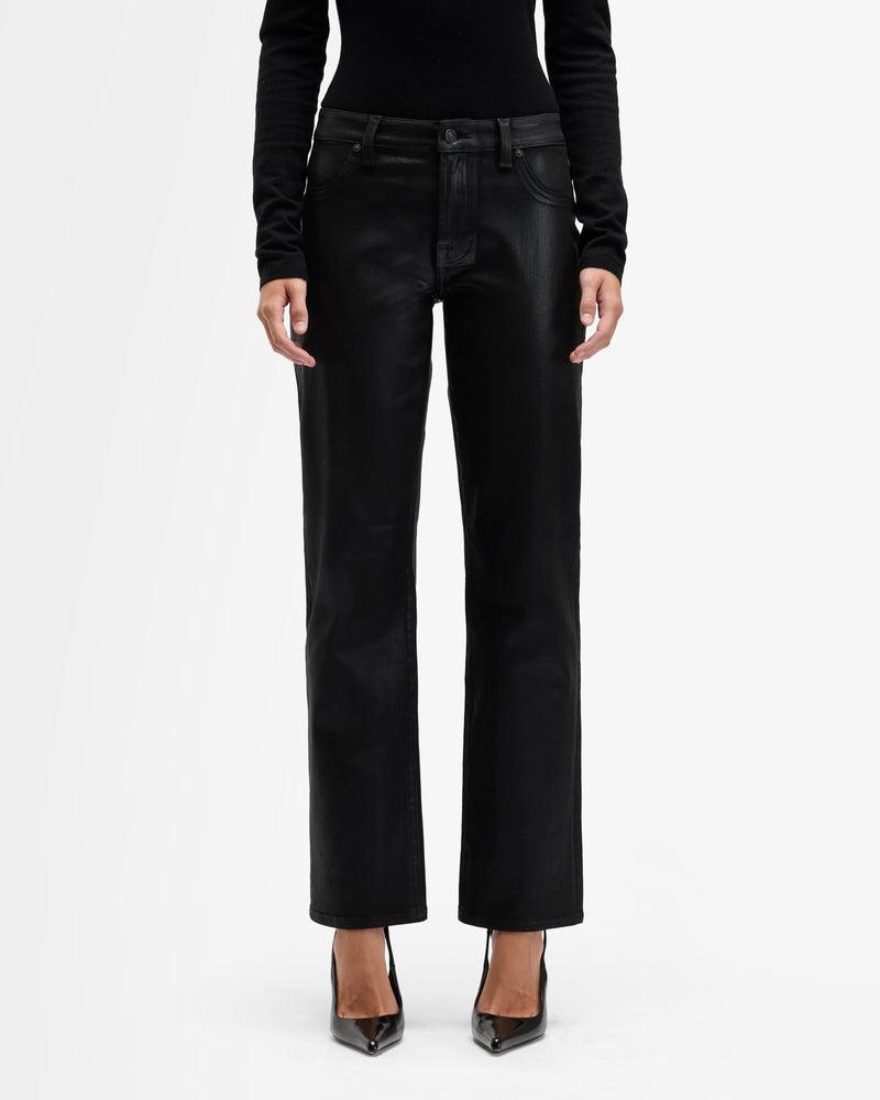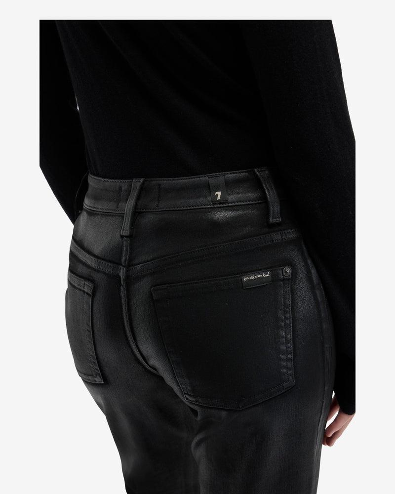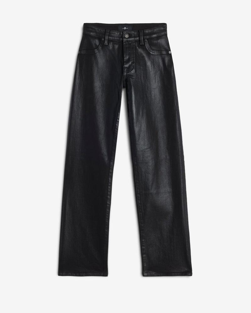Fits like: A straight leg fit with a full-length silhouette that offers a sleek, timeless look. Designed to sit comfortably at the waist and fall effortlessly through the legs.Feels like: The comfort and stretch of 7 denim with the look of leather. The Details: Black wash with subtle, matte sheen Zip fly with button cl