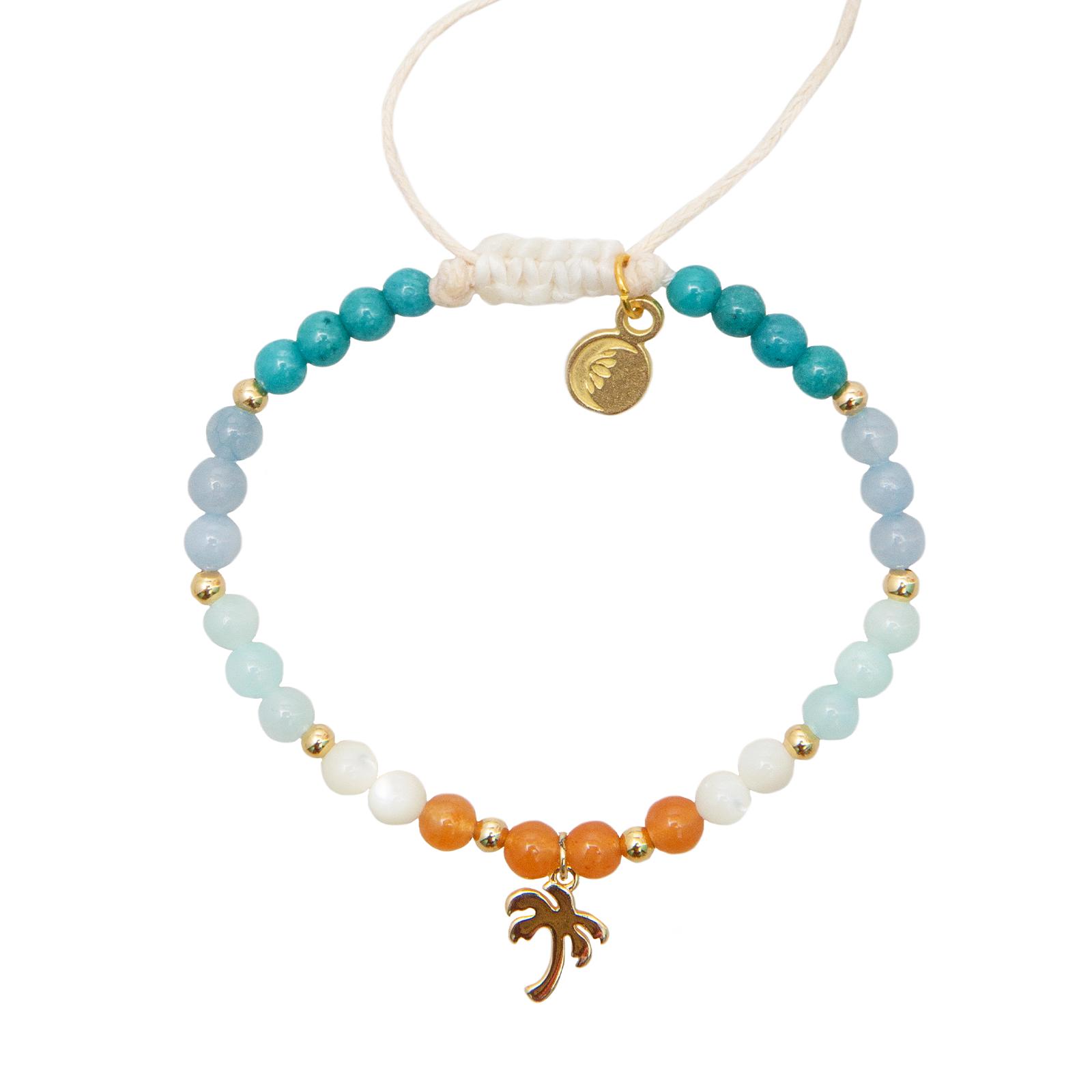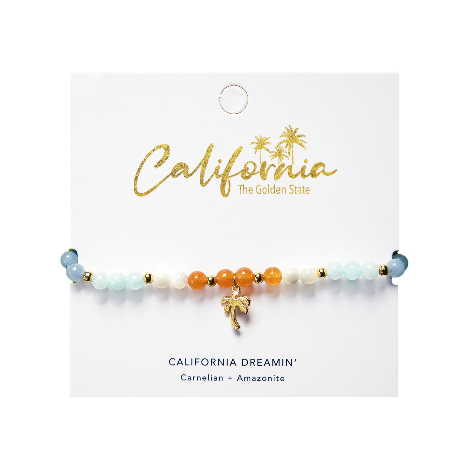 Inspired by the iconic palm tree horizons, stunning sunsets, and laid-back energy of California’s Coastline, wear this bracelet as a reminder of everything you love about the Golden State! Carnelian provides a boost of energy and motivation. 1 Amazonite soothes the mind like the peaceful sway of a palm tree in the breeze. Together, these stones spark the warm thoughts and good vibes of a California Daydream.