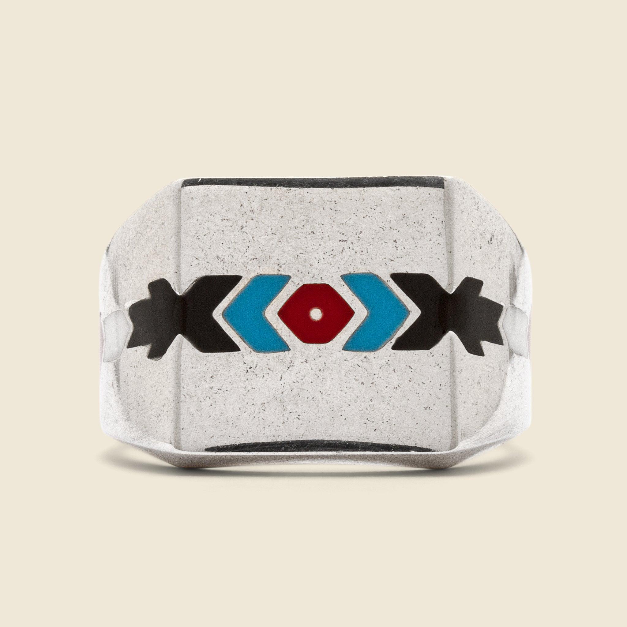 This ring from Jason LeCompte is made from solid sterling silver and detailed with a colorful geometric inlay for a vintage California-inspired look. .925 sterling Ceramic enamel inlays Cast & carved by hand Made in USAMaterials: .925 sterling silver