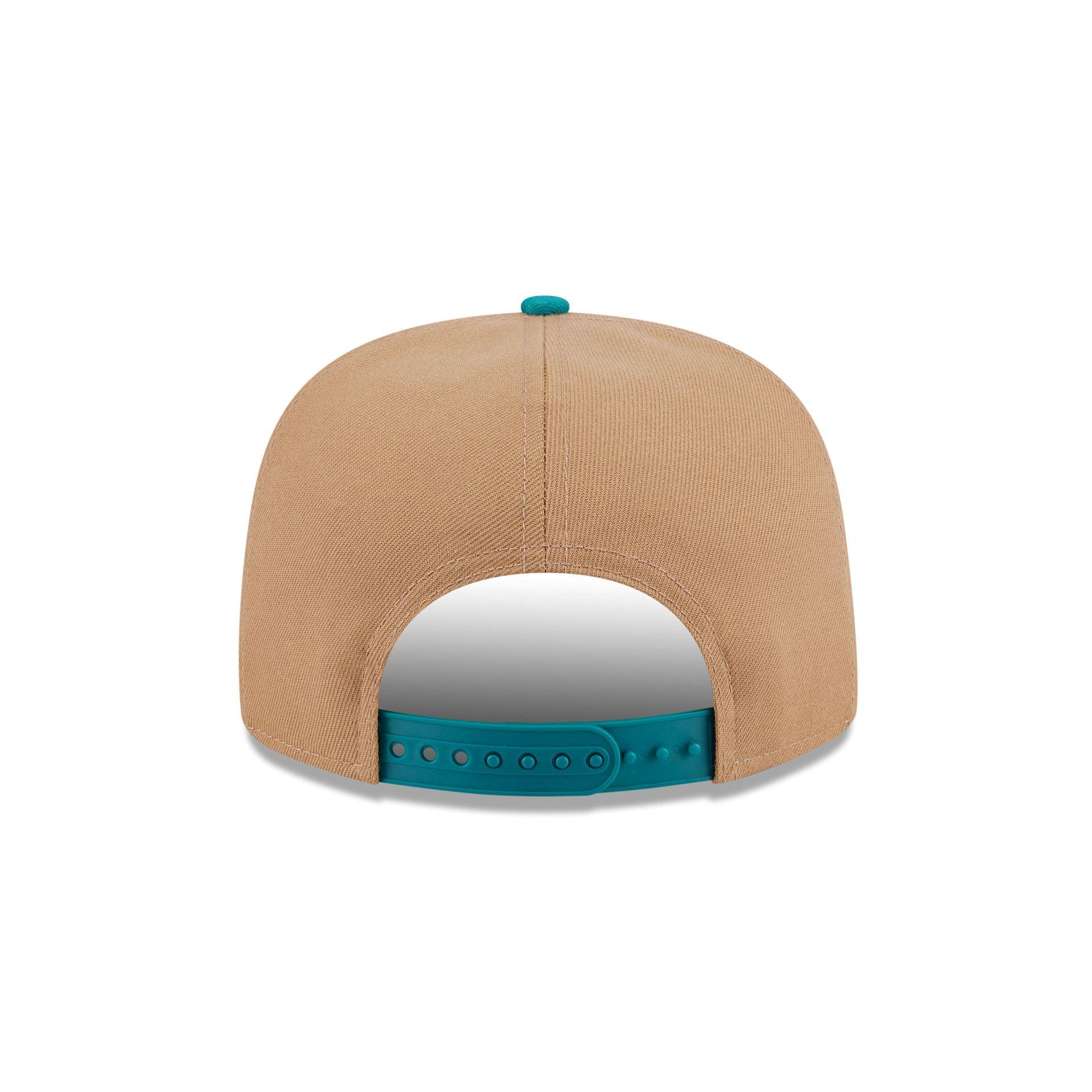 The California Golden Seals Khaki Golfer features an embroidered Golden Seals Historic logo at the front panels with an established date at the visor. Additional details include a snapback closure at the rear and a green undervisor.