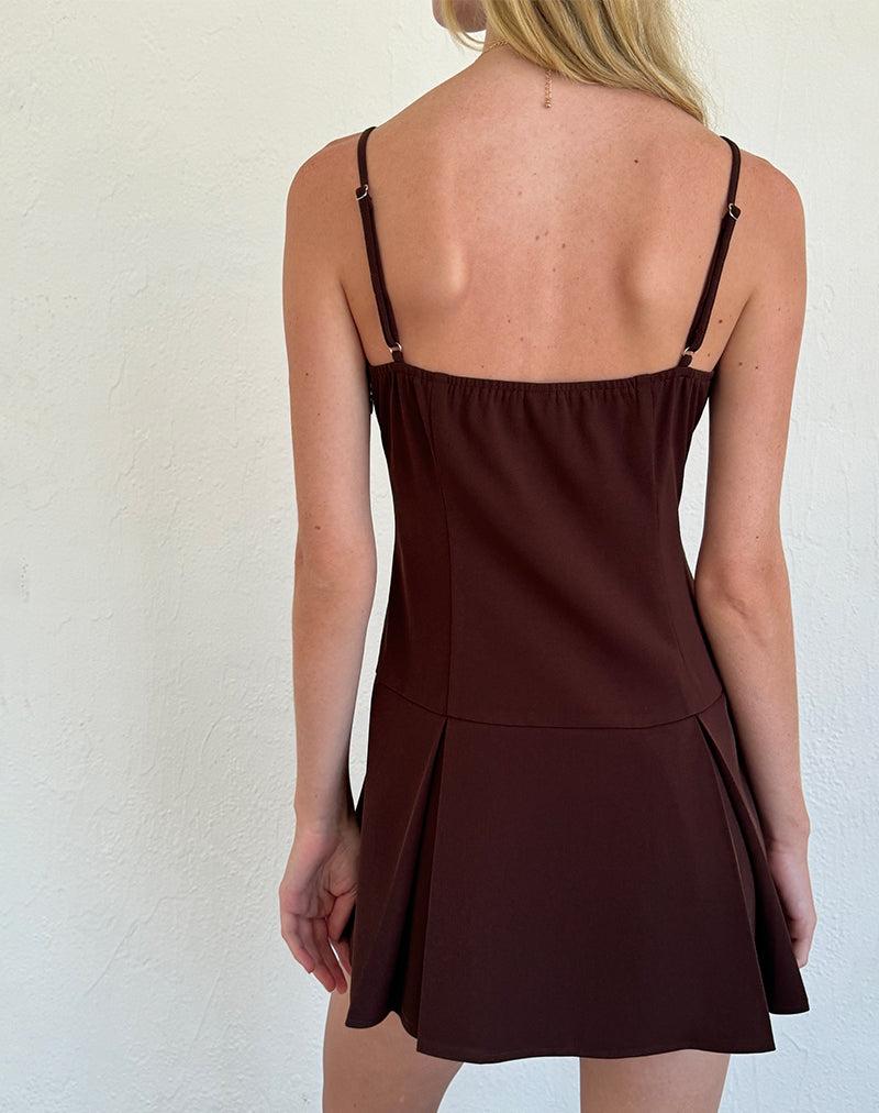 The mini dress on dreams. In bitter chocolate, the Calilia features a drop waist with soft tailoring fit and minimal pleated detailing in loose skirt. Complete with scoop neckline and thin adjustable straps with pink bow details. MODEL WEARS SIZE: EXTRA SMALL - MODEL HEIGHT:5'7 - FABRIC CONTENT: 98% POLYESTER 2% ELASTANE