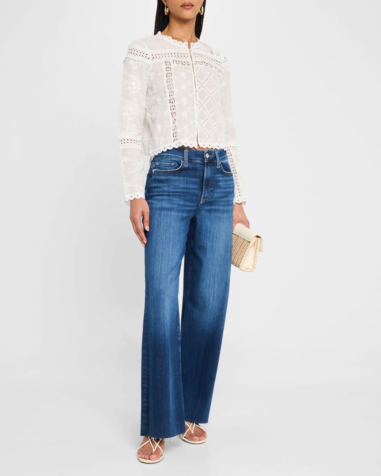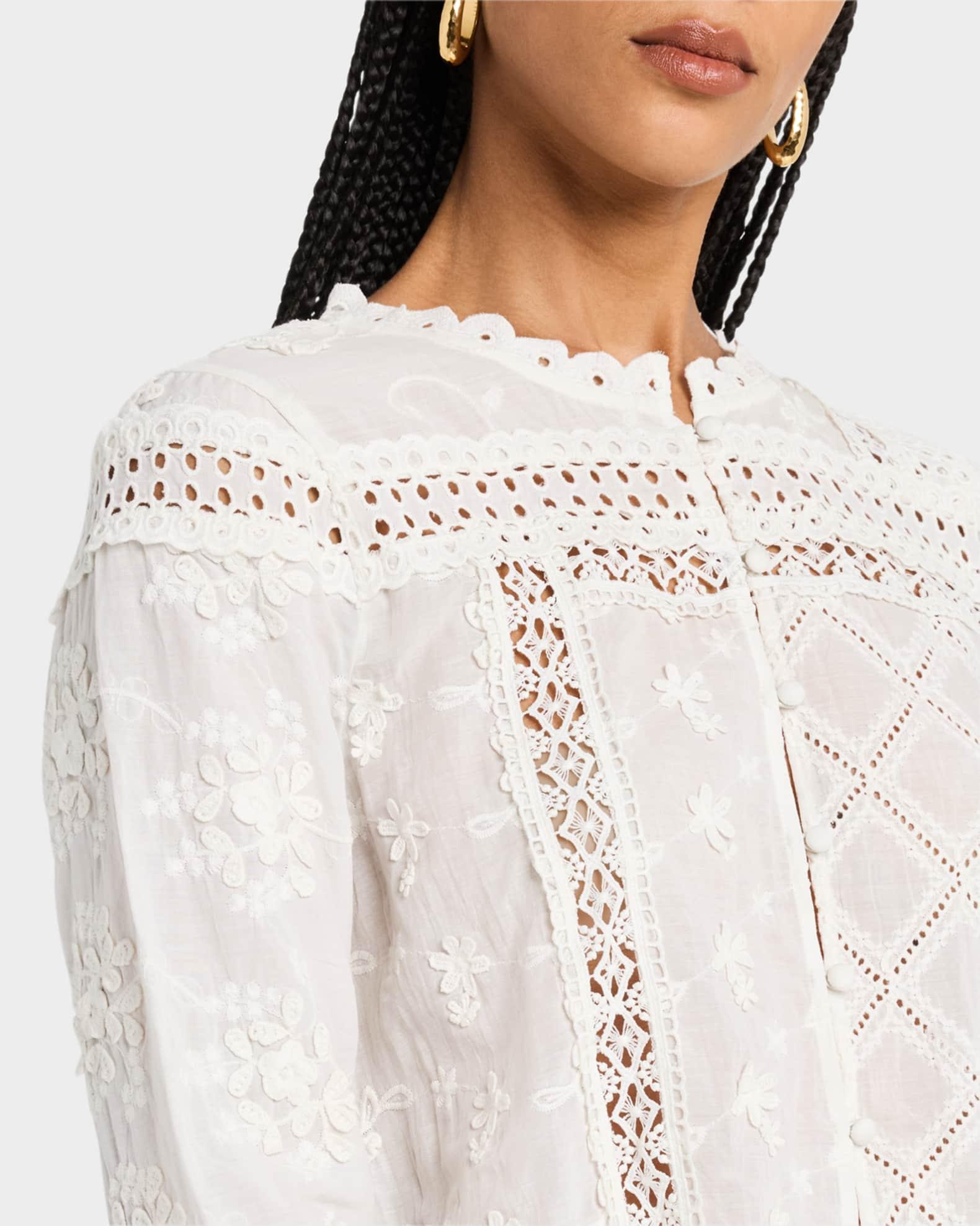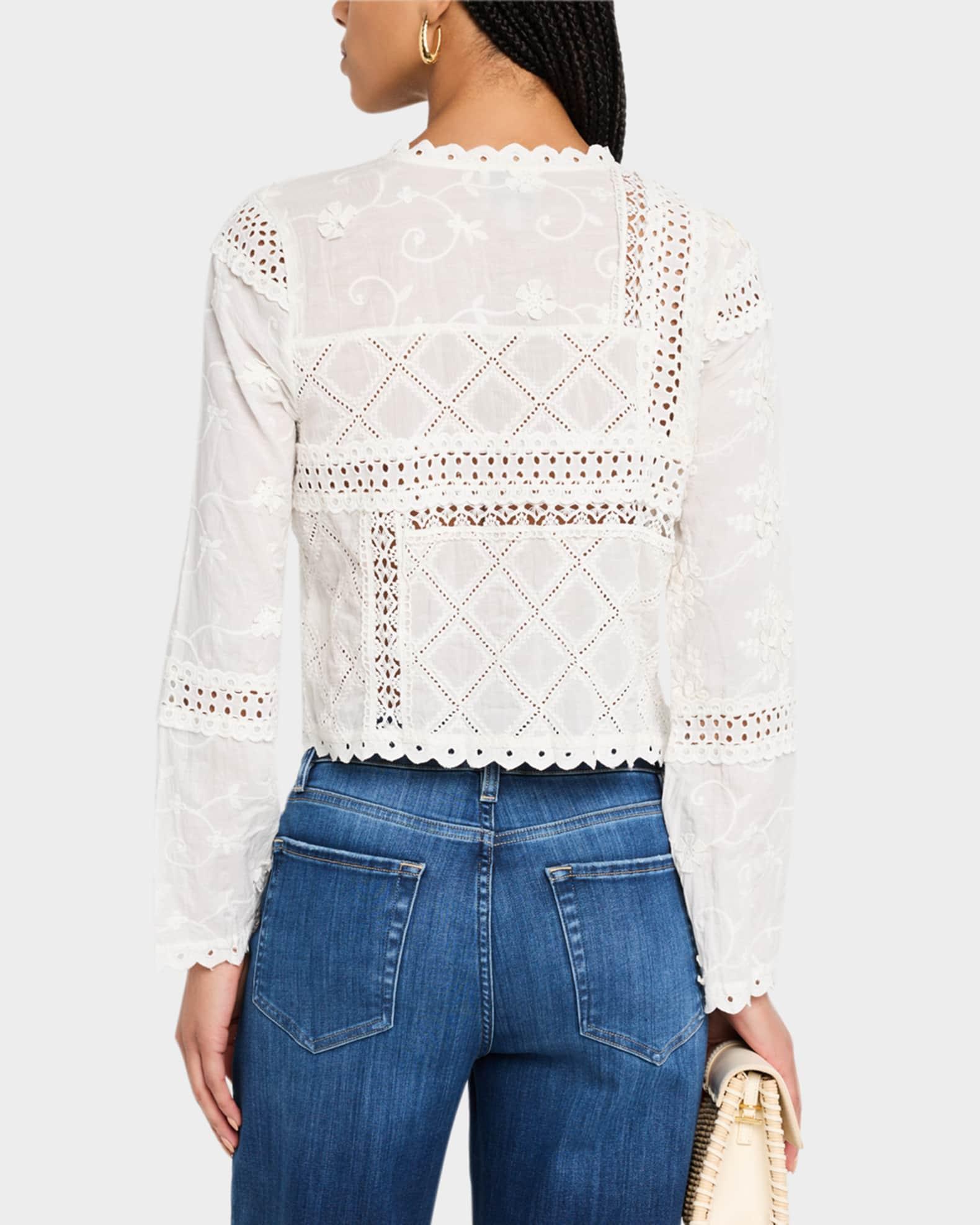 Johnny Was "Calista" shirt jacket with mixed lace inset and tonal floral embroidery Crew neckline; button front Long sleeves Scalloped cuffs, collar, and hem Cropped style Relaxed fit Cotton/viscose Imported Please note: This merchandise may have a distressed effect. It is a unique feature that enhances the product and is not considered a defect.