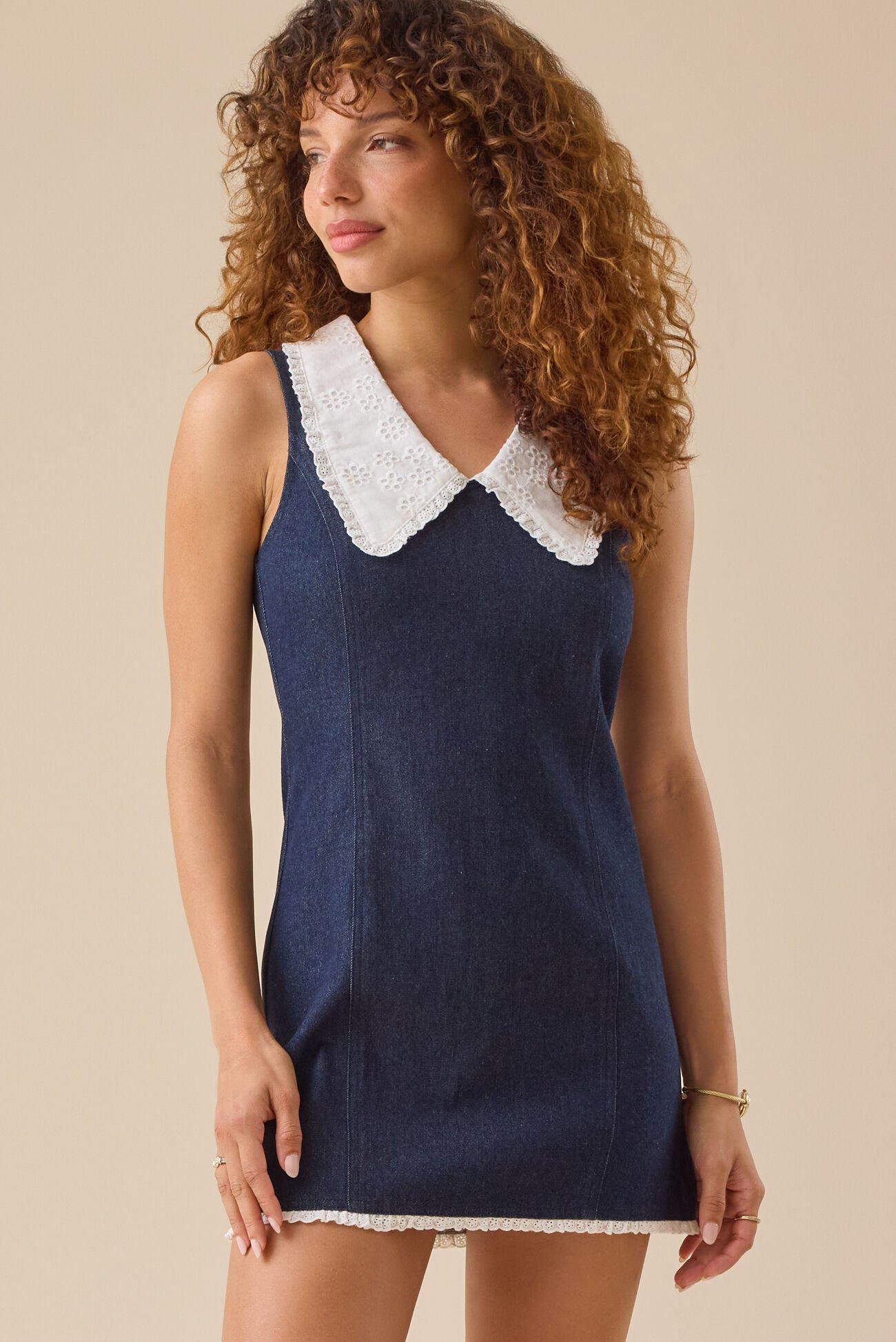 This denim mini dress features a crisp eyelet collar and delicate lace trim, adding a touch of femininity to its classic shift silhouette. The structured yet easy shape makes it perfect for casual days with a polished twist.