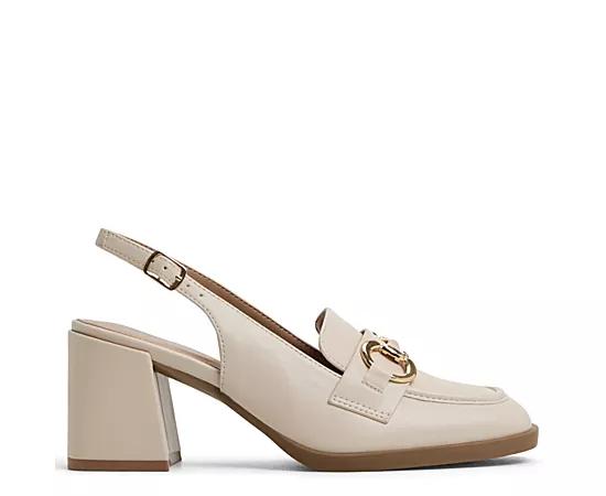 Call It Spring Linnette Womens Pump Off White Summers in the office benefit from the Linnette Pump from Call It Spring. Featuring a faux leather upper with a golden link detail, this Pump also has a square moc toe. The B. E. D. Foam comfort insole cushions your steps, while the chunky block heel gives the perfect lift. Synthetic upper Slingback buckle strap Gold-tone hardware Foam comfort insole 2 block heel