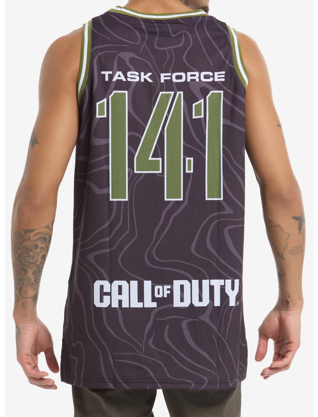 Gear up like an elite operator with this Call of Duty Ghost basketball jersey! Featuring an allover tactical-inspired design with Ghost front and center, and Task Force 141 printed on the back, this sleeveless jersey brings military-meets-streetwear vibes. The bold varsity-style lettering and camo colors make it a must-have for any Call of Duty fan.100% polyesterWash cold; dry lowImportedListed in men's/unisex sizesModel is 6'1"Model wears size Medium