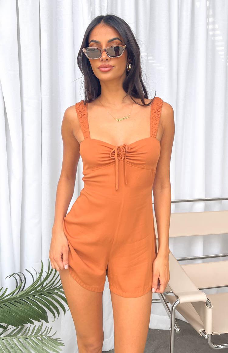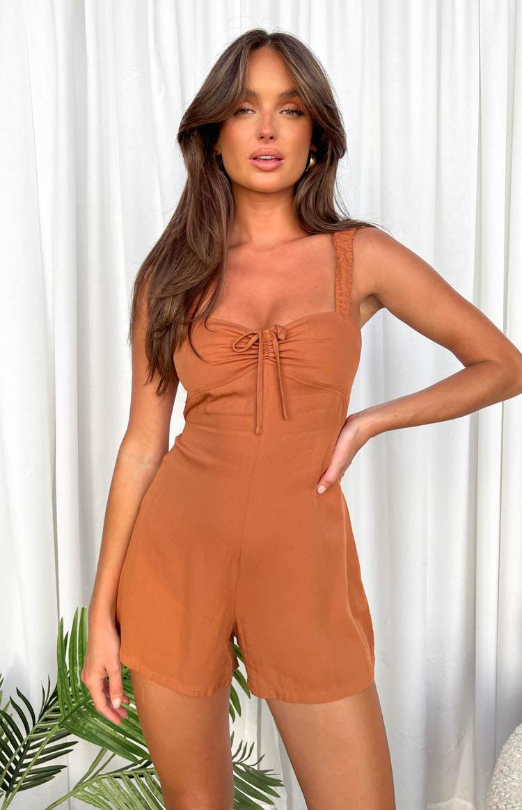Brown Utility Playsuit The comfiest playsuit for when you are busy running errands! Pair with sneakers or sandals and a cross body bag. Playsuit style Elasticated shoulder straps Tie at centre of bust Tie-up at back Lightweight material with no stretch Invisible zipper on back Unlined