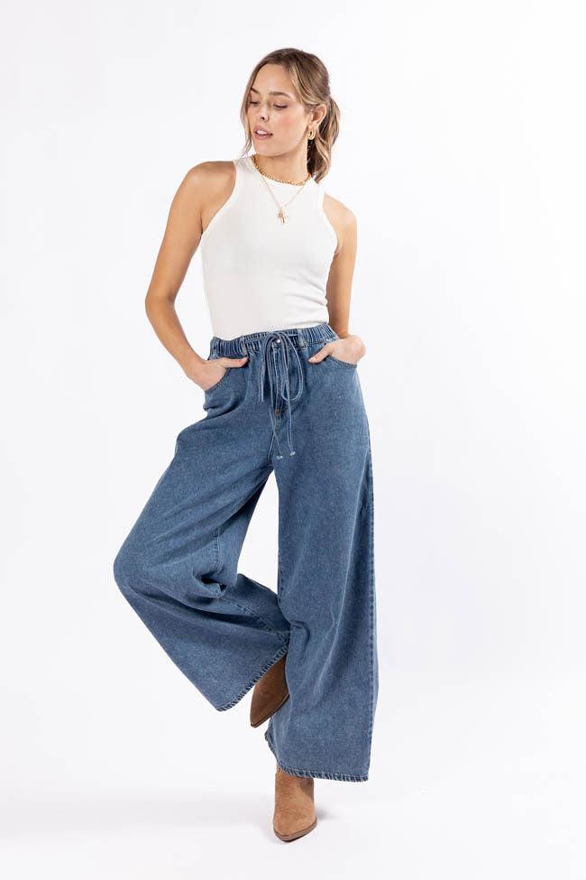 Details Drawstring Waist Loose Chambray Pants Fabric has no stretch besides in elastic waist Elastic drawstring waist, functional pockets, zipper/ button up closure Unlined Size small inseam: 31" Material and Care 100% cotton Hand wash cold, lay flat to dry Patterns may vary Materials may have natural variations Colors may vary from different viewing devices.